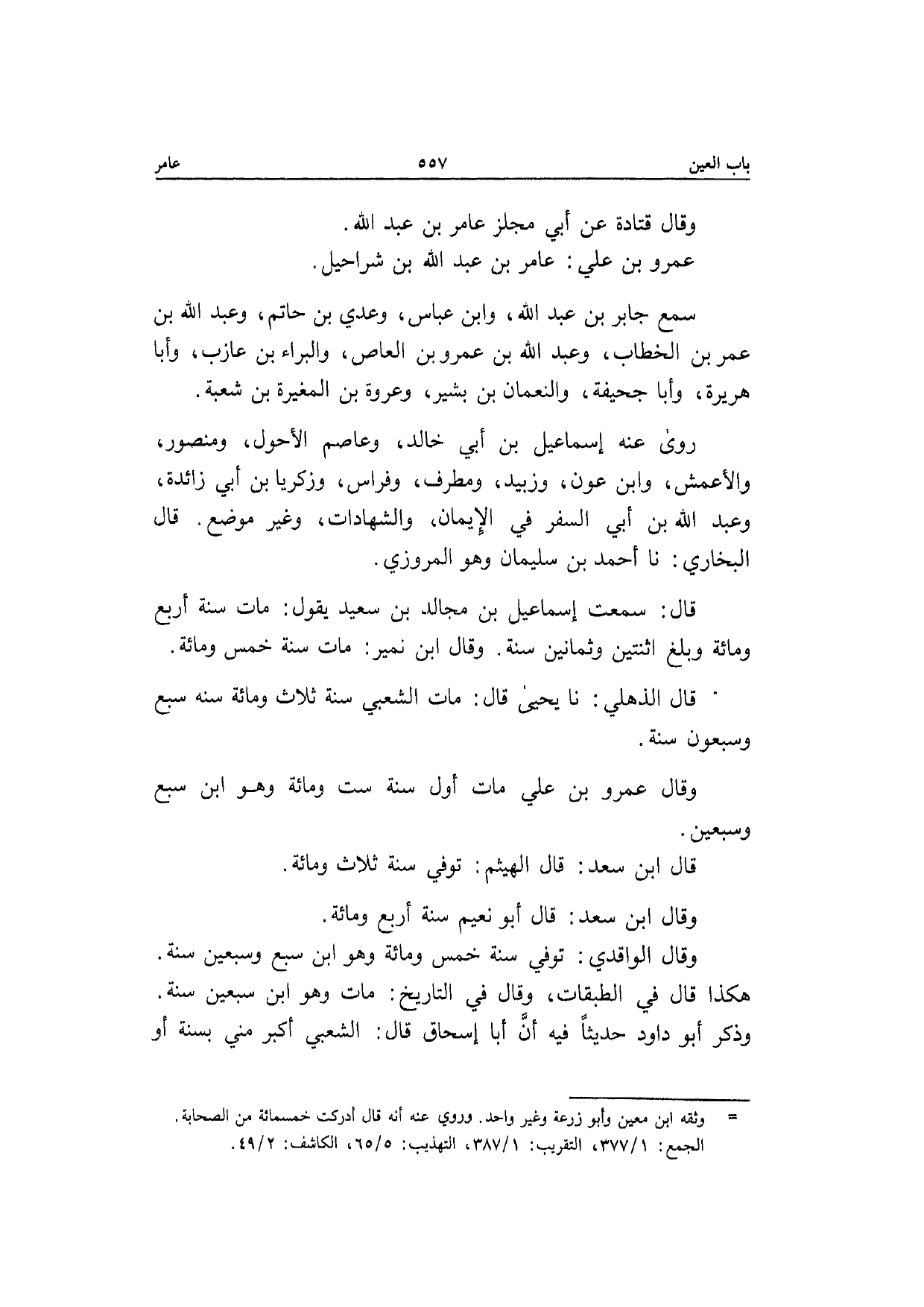 عَمْرو بن عَلّي عَامر بن عبد الله بن شرَاحِيل سمع جَابر بن عبد الله وَابْن عَبَّاس وعدي بن حَاتِم وَعبد الله بن عمر بن الْخطاب وَعبد الله بن عَمْرو بن الْعَاصِ والبراء بن عَازِب وَأَبا هُرَيْرَة وَأَبا جُحَيْفَة والنعمان بن بشير وَعُرْوَة بن الْمُغيرَة بن شُعْبَة رَوَى عَنهُ إِسْمَاعِيل بن أبي خَالِد وَعَاصِم الْأَحول وَمَنْصُور وَالْأَعْمَش وَابْن عون وزبيد ومطرف وفراس وزَكَرِيا بن أبي زَائِدَة وَعبد الله بن أبي السّفر فِي الْإِيمَان والشهادات وَغير مَوضِع قَالَ البُخَارِيّ نَا أَحْمد بن سُلَيْمَان وَهُوَ الْمروزِي قَالَ سَمِعت إِسْمَاعِيل بن مجَالد بن سعيد يَقُول مَاتَ سنة أَربع وَمِائَة وَبلغ اثْنَتَيْنِ وَثَمَانِينَ سنة وَقَالَ ابْن نمير مَاتَ سنة خمس وَمِائَة قَالَ الذهلي نَا يَحْيَى قَالَ مَاتَ الشّعبِيّ سنة ثَلَاث وَمِائَة سنه سبع وَسَبْعُونَ سنة وَقَالَ عَمْرو بن عَلّي مَاتَ أول سنة سِتّ وَمِائَة وَهُوَ ابْن سبع وَسبعين قَالَ ابْن سعد قَالَ الْهَيْثَم توفّي سنة ثَلَاث وَمِائَة وَقَالَ ابْن سعد قَالَ أَبُو نعيم سنة أَربع وَمِائَة وَقَالَ الْوَاقِدِيّ توفّي سنة خمس وَمِائَة وَهُوَ ابْن سبع وَسبعين سنة هَكَذَا قَالَ فِي الطَّبَقَات وَقَالَ فِي التَّارِيخ مَاتَ وَهُوَ ابْن سبعين سنة وَذكر أَبُو دَاوُد حَدِيثا فِيهِ أَن أَبَا إِسْحَاق قَالَ الشّعبِيّ أكبر مني بِسنة أَو