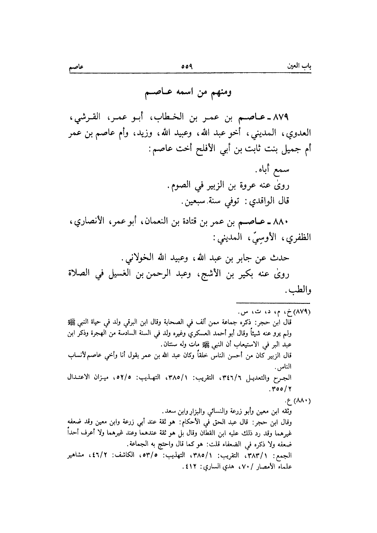 879 - عَاصِم بن عمر بن الْخطاب أَبُو عمر الْقرشِي الْعَدوي الْمَدِينِيّ أَخُو عبد الله وَعبيد الله وَزيد وَأم عَاصِم بن عمر أم جميل بنت ثَابت بن أبي الْأَفْلَح أُخْت عَاصِم سمع أَبَاهُ رَوَى عَنهُ عُرْوَة بن الزبير فِي الصَّوْم قَالَ الْوَاقِدِيّ توفّي سنة سبعين