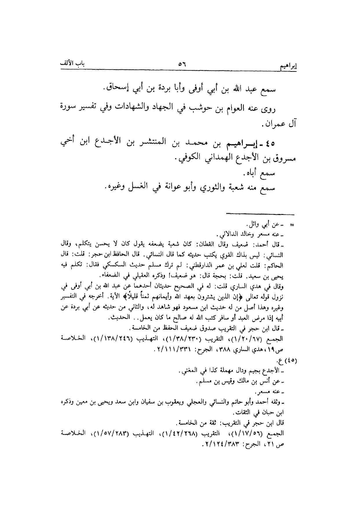 45 - إِبْرَاهِيم بن مُحَمَّد بن الْمُنْتَشِر بن الأجدع ابْن أخي مَسْرُوق بن الأجدع الْهَمدَانِي الْكُوفِي سمع أَبَاهُ سمع مِنْهُ شُعْبَة وَالثَّوْري وَأَبُو عوَانَة فِي الْغسْل وَغَيره
