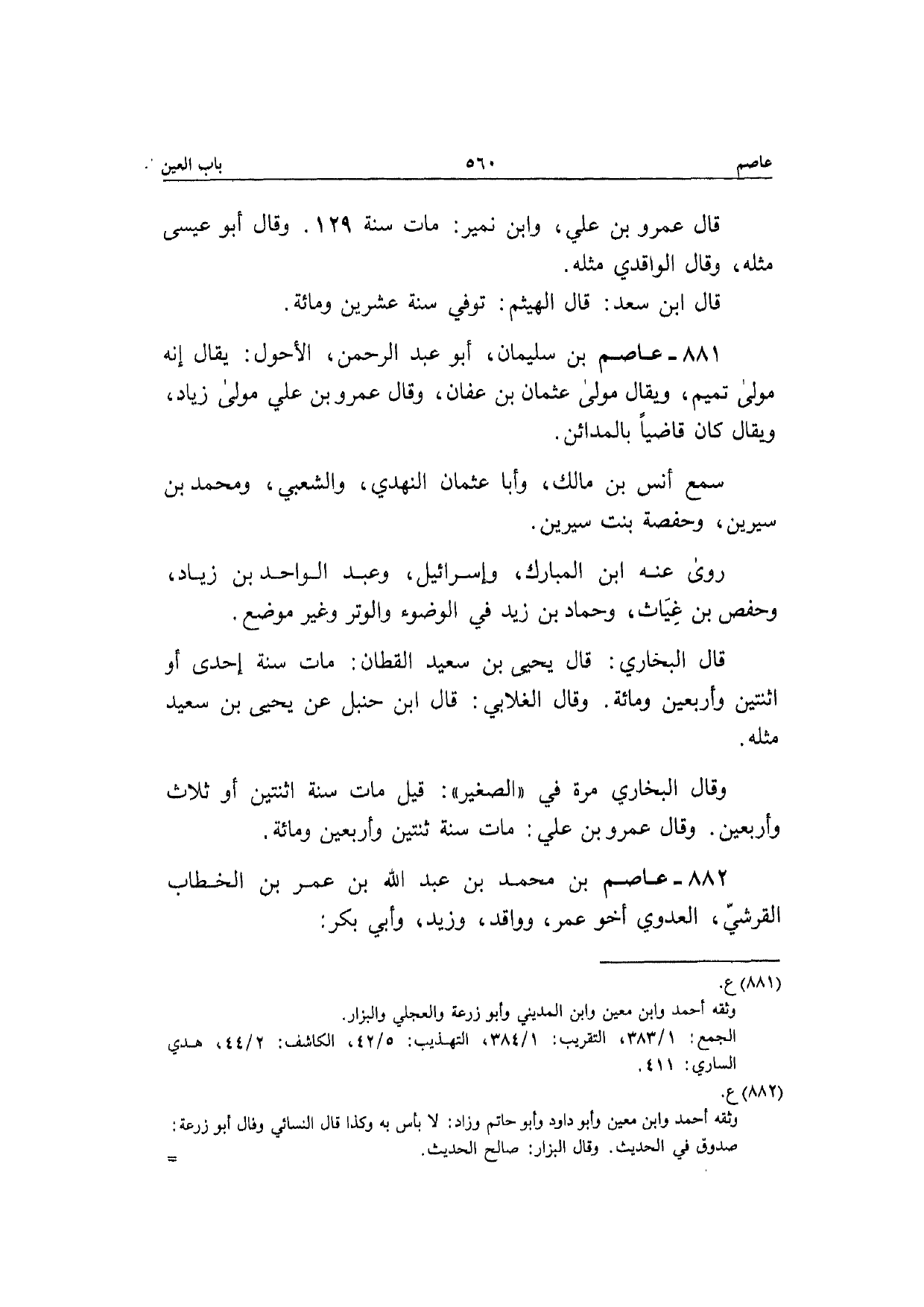 881 - عَاصِم بن سُلَيْمَان أَبُو عبد الرَّحْمَن الْأَحول يُقَال إِنَّه مولَى تَمِيم وَيُقَال مولَى عُثْمَان بن عَفَّان وَقَالَ عَمْرو بن عَلّي مولَى زِيَاد وَيُقَال كَانَ قَاضِيا بِالْمَدَائِنِ سمع أنس بن مَالك وَأَبا عُثْمَان النَّهْدِيّ وَالشعْبِيّ وَمُحَمّد بن سِيرِين وَحَفْصَة بنت سِيرِين رَوَى عَنهُ ابْن الْمُبَارك وَإِسْرَائِيل وَعبد الْوَاحِد بن زِيَاد وَحَفْص بن غياث وَحَمَّاد بن زيد فِي الْوضُوء وَالْوتر وَغير مَوضِع قَالَ البُخَارِيّ قَالَ يَحْيَى بن سعيد الْقطَّان مَاتَ سنة إِحْدَى أَو اثْنَتَيْنِ وَأَرْبَعين وَمِائَة وَقَالَ الْغلابِي قَالَ ابْن حَنْبَل عَن يَحْيَى بن سعيد مثله وَقَالَ البُخَارِيّ مرّة فِي ((الصَّغِير)) قيل مَاتَ سنة اثْنَتَيْنِ أَو ثَلَاث وَأَرْبَعين وَقَالَ عَمْرو بن عَلّي مَاتَ سنة ثِنْتَيْنِ وَأَرْبَعين وَمِائَة