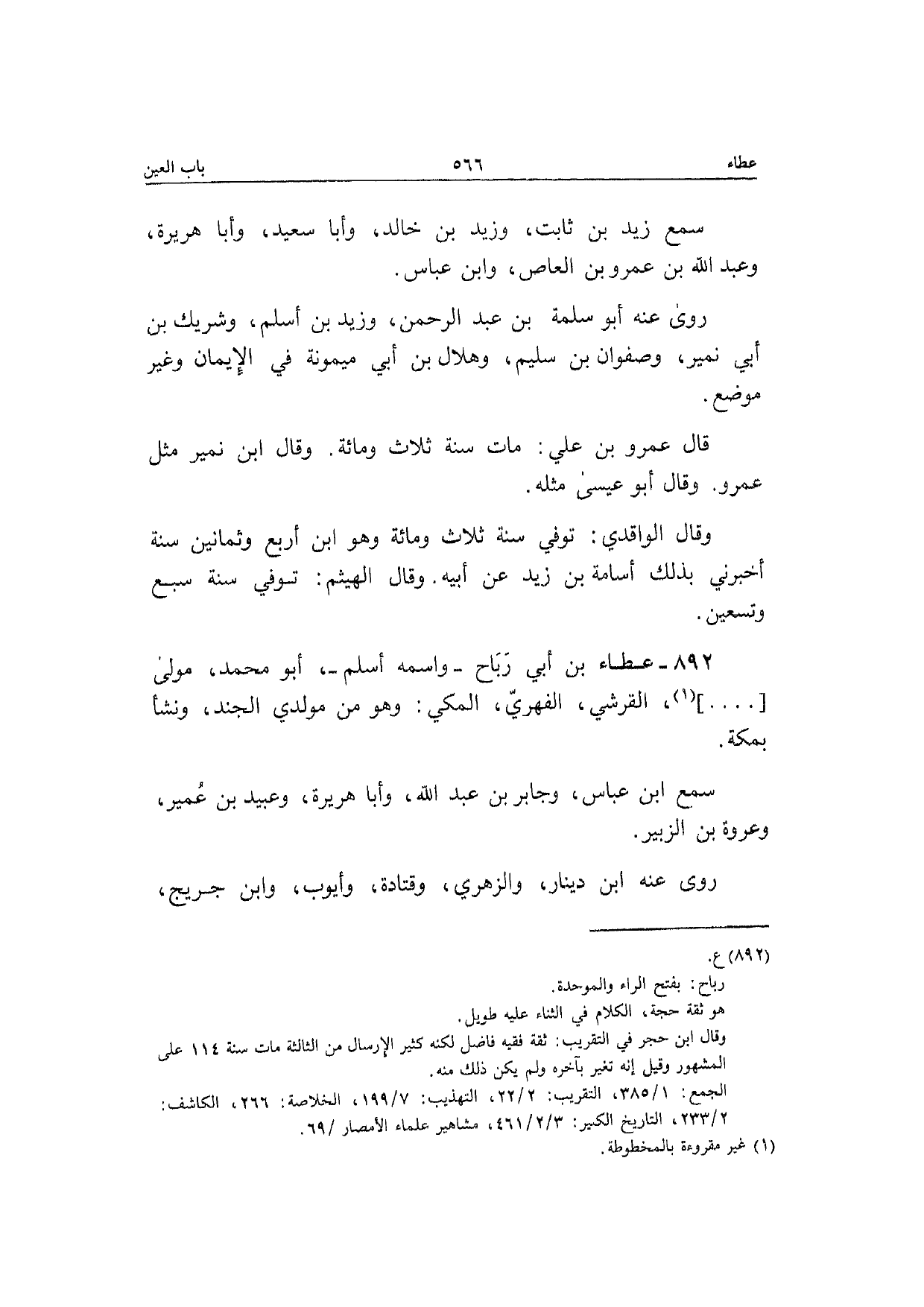 892 - عَطاء بن أبي رَبَاح واسْمه أسلم أَبُو مُحَمَّد مولَى الْقرشِي الفِهري الْمَكِّيّ وَهُوَ من مولدِي الْجند وَنَشَأ بِمَكَّة سمع ابْن عَبَّاس وَجَابِر بن عبد الله وَأَبا هُرَيْرَة وَعبيد بن عُمَيْر وَعُرْوَة بن الزبير رَوَى عَنهُ ابْن دِينَار وَالزهْرِيّ وَقَتَادَة وَأَيوب وَابْن جريج