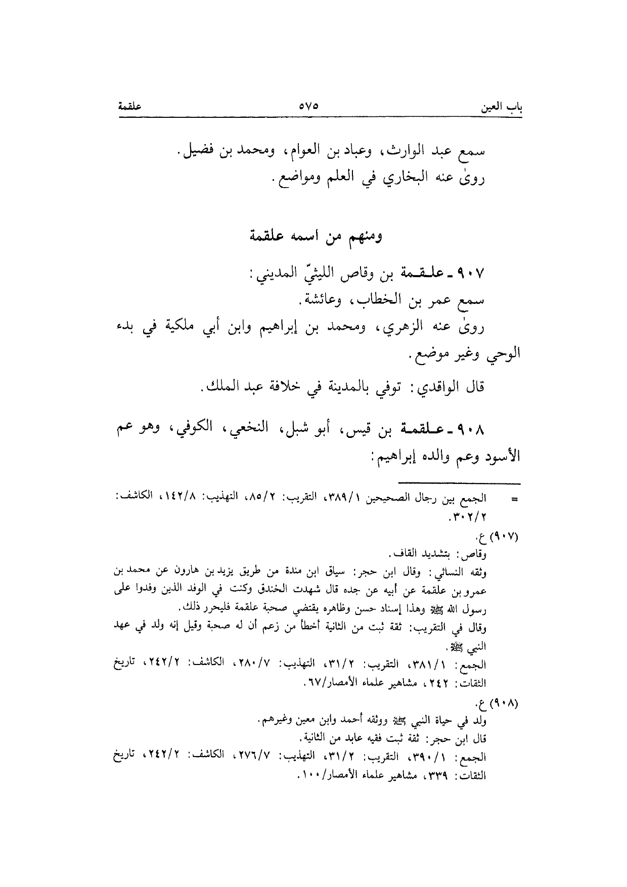 907 - عَلْقَمَة بن وَقاص اللَّيْثِيّ الْمَدِينِيّ سمع عمر بن الْخطاب وَعَائِشَة رَوَى عَنهُ الزُّهْرِيّ وَمُحَمّد بن إِبْرَاهِيم وَابْن أبي ملكية فِي بَدْء الْوَحْي وَغير مَوضِع قَالَ الْوَاقِدِيّ توفّي بِالْمَدِينَةِ فِي خلَافَة عبد الْملك
