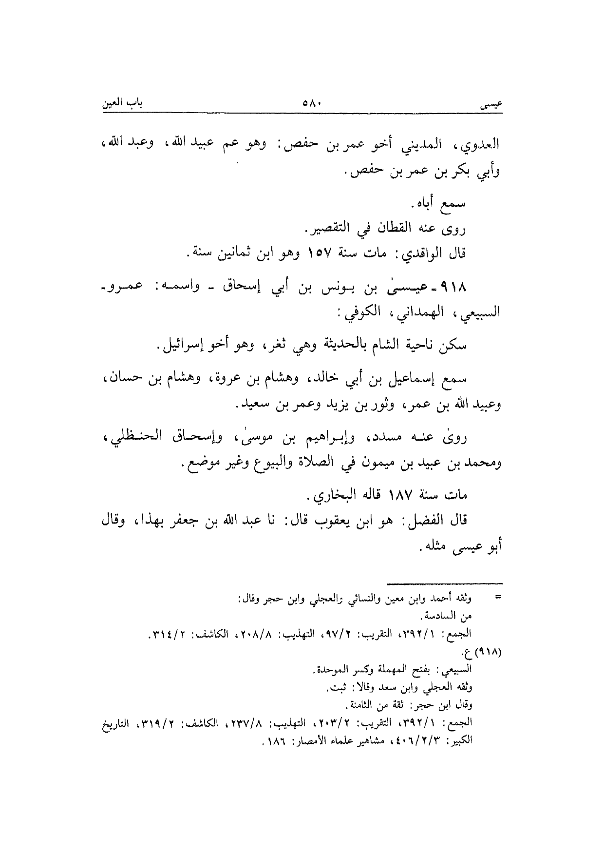 918 - عِيسَى بن يُونُس بن أبي إِسْحَاق واسْمه عَمْرو السبيعِي الْهَمدَانِي الْكُوفِي سكن نَاحيَة الشَّام بالحديثة وَهِي ثغر وَهُوَ أَخُو إِسْرَائِيل سمع إِسْمَاعِيل بن أبي خَالِد وَهِشَام بن عُرْوَة وَهِشَام بن حسان وَعبيد الله بن عمر وثور بن يزِيد وَعمر بن سعيد رَوَى عَنهُ مُسَدّد وَإِبْرَاهِيم بن مُوسَى وَإِسْحَاق الْحَنْظَلِي وَمُحَمّد بن عبيد بن مَيْمُون فِي الصَّلَاة والبيوع وَغير مَوضِع مَاتَ سنة 187 قَالَه البُخَارِيّ قَالَ الْفضل هُوَ ابْن يَعْقُوب قَالَ نَا عبد الله بن جَعْفَر بِهَذَا وَقَالَ أَبُو عِيسَى مثله