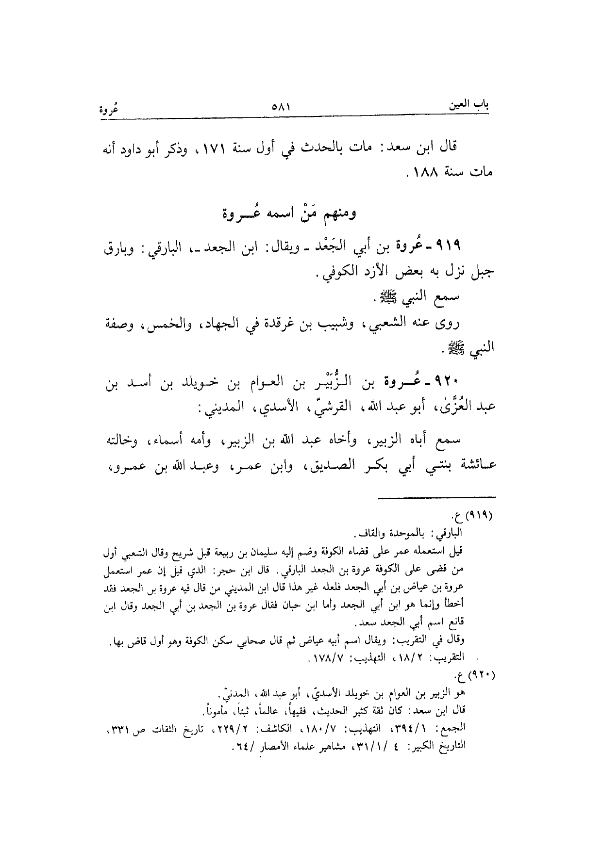 920 - عُرْوَة بن الزبير بن الْعَوام بن خويلد بن أَسد بن عبد الْعُزَّى أَبُو عبد الله الْقرشِي الْأَسدي الْمَدِينِيّ سمع أَبَاهُ الزبير وأخاه عبد الله بن الزبير وَأمه أَسمَاء وخالته عَائِشَة بِنْتي أبي بكر الصّديق وَابْن عمر وَعبد الله بن عَمْرو