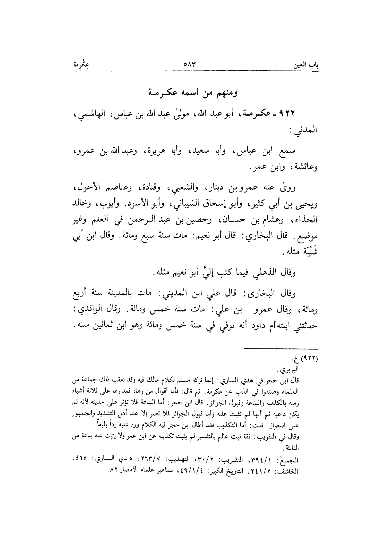 922 - عِكْرِمَة أَبُو عبد الله مولَى عبد الله بن عَبَّاس الْهَاشِمِي الْمدنِي سمع ابْن عَبَّاس وَأَبا سعيد وَأَبا هُرَيْرَة وَعبد الله بن عَمْرو وَعَائِشَة وَابْن عمر رَوَى عَنهُ عَمْرو بن دِينَار وَالشعْبِيّ وَقَتَادَة وَعَاصِم الْأَحول وَيَحْيَى بن أبي كثير وَأَبُو إِسْحَاق الشَّيْبَانِيّ وَأَبُو الْأسود وَأَيوب وخَالِد الْحذاء وَهِشَام بن حسان وحصين بن عبد الرَّحْمَن فِي الْعلم وَغير مَوضِع قَالَ البُخَارِيّ قَالَ أَبُو نعيم مَاتَ سنة سبع وَمِائَة وَقَالَ ابْن أبي شيبَة مثله وَقَالَ الذهلي فِيمَا كتب إِلَيّ أَبُو نعيم مثله وَقَالَ البُخَارِيّ قَالَ عَلّي ابْن الْمَدِينِيّ مَاتَ بِالْمَدِينَةِ سنة أَربع وَمِائَة وَقَالَ عَمْرو بن عَلّي مَاتَ سنة خمس وَمِائَة وَقَالَ الْوَاقِدِيّ حَدَّثتنِي ابْنَته أم دَاوُد أَنه توفّي فِي سنة خمس وَمِائَة وَهُوَ ابْن ثَمَانِينَ سنة
