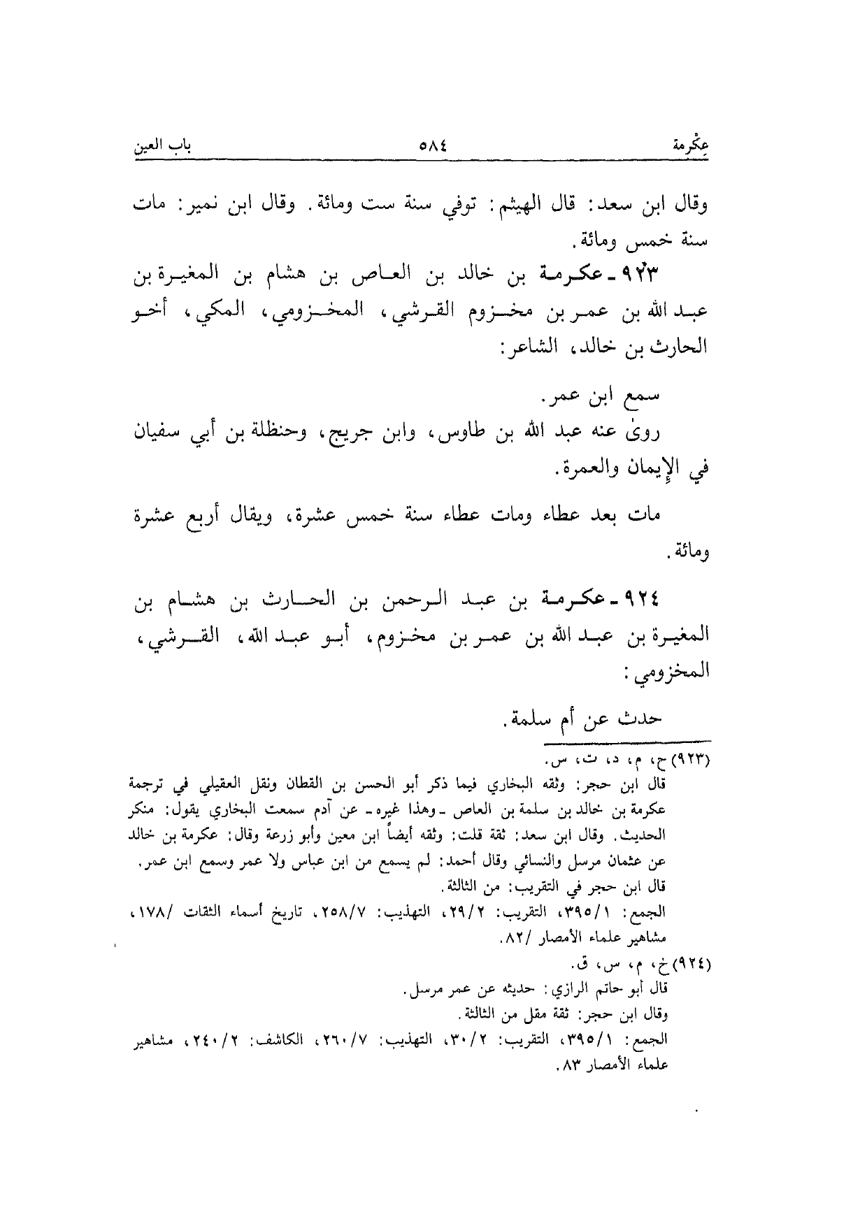 923 - عِكْرِمَة بن خَالِد بن الْعَاصِ بن هِشَام بن الْمُغيرَة بن عبد الله بن عمر بن مَخْزُوم الْقرشِي المَخْزُومِي الْمَكِّيّ أَخُو الْحَارِث بن خَالِد الشَّاعِر سمع ابْن عمر رَوَى عَنهُ عبد الله بن طَاوس وَابْن جريج وحَنْظَلَة بن أبي سُفْيَان فِي الْإِيمَان وَالْعمْرَة مَاتَ بعد عَطاء وَمَات عَطاء سنة خمس عشرَة وَيُقَال أَربع عشرَة وَمِائَة
