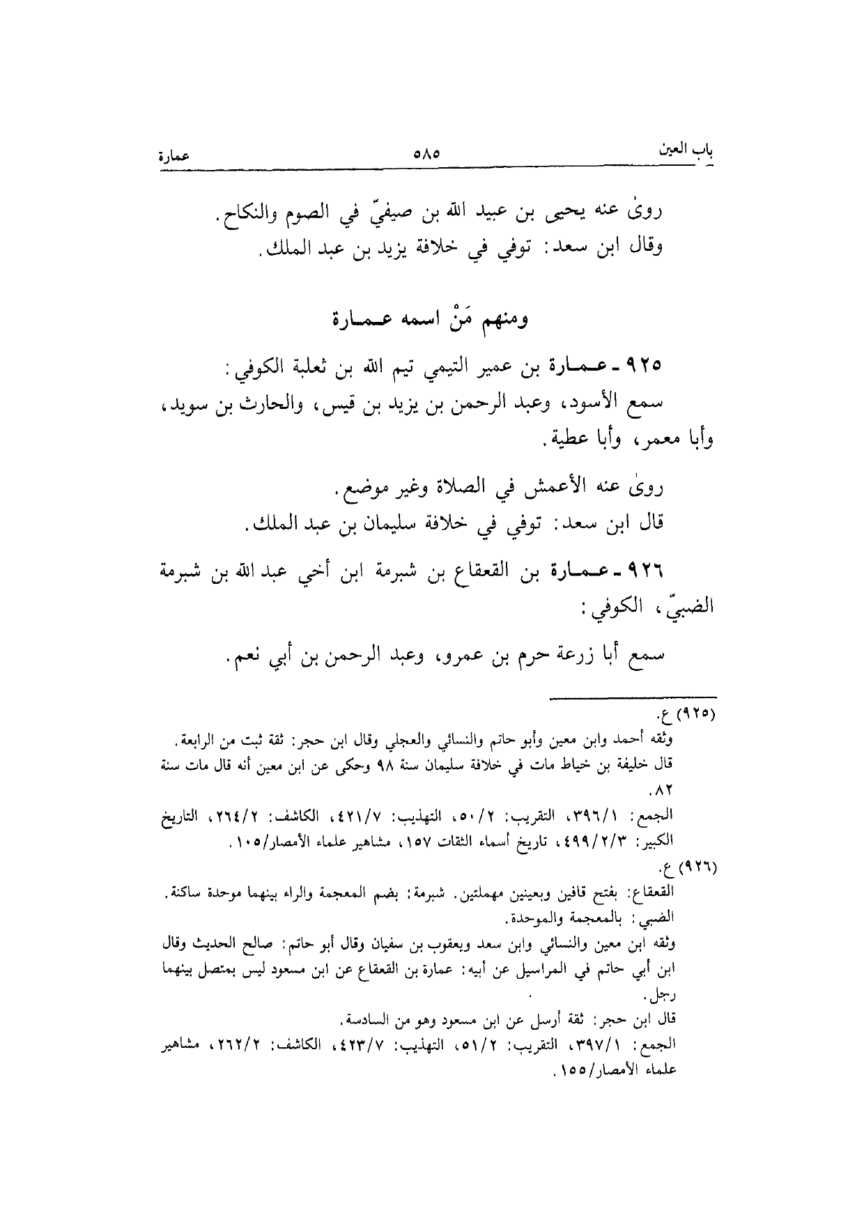 925 - عمَارَة بن عُمَيْر التَّيْمِيّ تيم الله بن ثَعْلَبَة الْكُوفِي سمع الْأسود وَعبد الرَّحْمَن بن يزِيد بن قيس والْحَارث بن سُوَيْد وَأَبا معمر وَأَبا عَطِيَّة رَوَى عَنهُ الْأَعْمَش فِي الصَّلَاة وَغير مَوضِع قَالَ ابْن سعد توفّي فِي خلَافَة سُلَيْمَان بن عبد الْملك