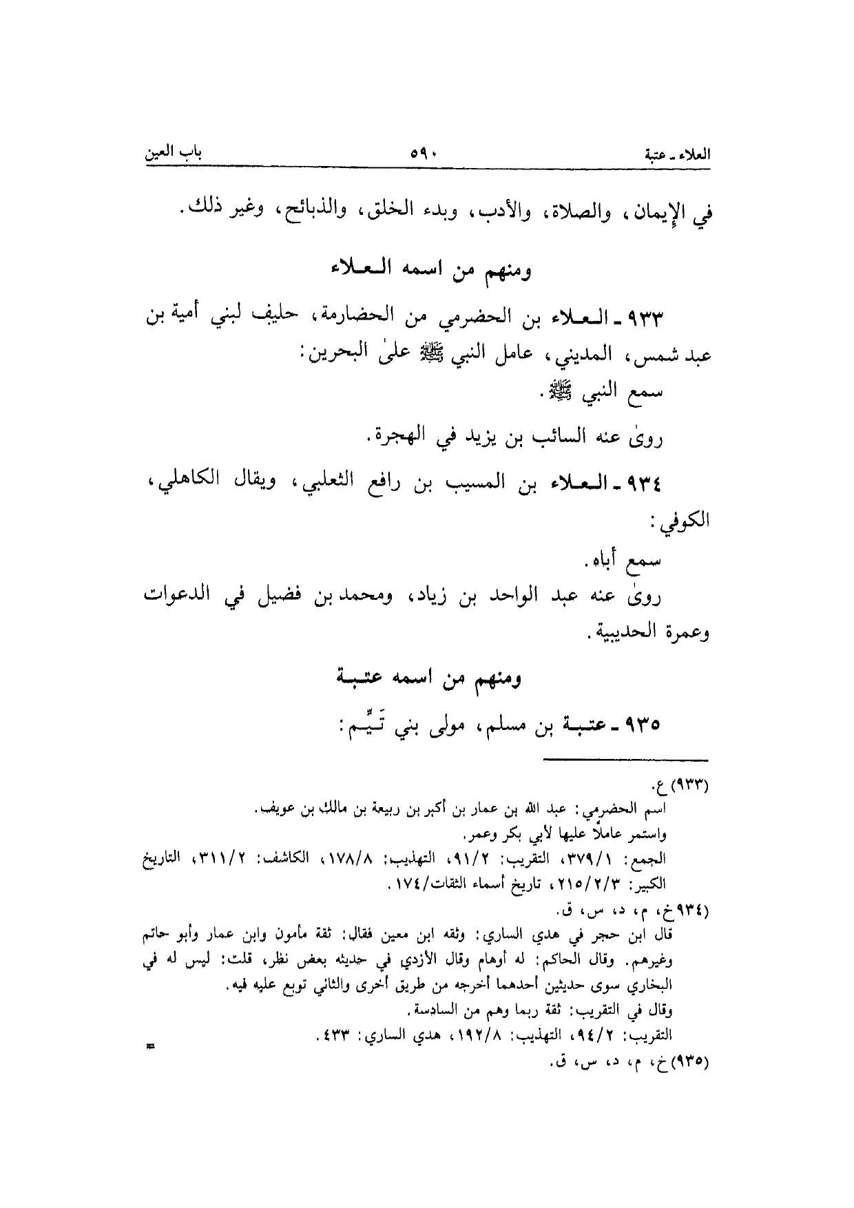 933 - الْعَلَاء بن الْحَضْرَمِيّ من الحضارمة حَلِيف لبني أُميَّة بن عبد شمس الْمَدِينِيّ عَامل النَّبِي صَلَّى الله عَلَيْهِ وَسلم عَلَى الْبَحْرين سمع النَّبِي صَلَّى الله عَلَيْهِ وَسلم رَوَى عَنهُ السَّائِب بن يزِيد فِي الْهِجْرَة