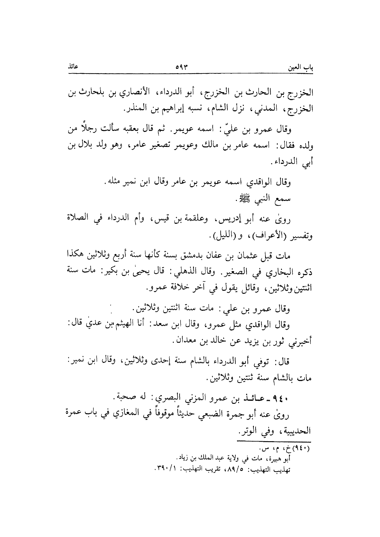 الْخَزْرَج بن الْحَارِث بن الْخَزْرَج أَبُو الدَّرْدَاء الْأنْصَارِيّ بن الْحَارِث بن الْخَزْرَج الْمدنِي نزل الشَّام نسبه إِبْرَاهِيم بن الْمُنْذر وَقَالَ عَمْرو بن عَلّي اسْمه عُوَيْمِر ثمَّ قَالَ بعقبه سَأَلت رجلا من وَلَده فَقَالَ اسْمه عَامر بن مَالك وعويمر تَصْغِير عَامر وَهُوَ ولد بِلَال بن أبي الدَّرْدَاء وَقَالَ الْوَاقِدِيّ اسْمه عُوَيْمِر بن عَامر وَقَالَ ابْن نمير مثله سمع النَّبِي صَلَّى الله عَلَيْهِ وَسلم رَوَى عَنهُ أَبُو إِدْرِيس وعلقمة بن قيس وَأم الدَّرْدَاء فِي الصَّلَاة وَتَفْسِير (الْأَعْرَاف) و (اللَّيْل) مَاتَ قبل عُثْمَان بن عَفَّان بِدِمَشْق بِسنة كَأَنَّهَا سنة أَربع وَثَلَاثِينَ هَكَذَا ذكره البُخَارِيّ فِي الصَّغِير وَقَالَ الذهلي قَالَ يَحْيَى بن بكير مَاتَ سنة اثْنَتَيْنِ وَثَلَاثِينَ وَقَائِل يَقُول فِي آخر خلَافَة عَمْرو وَقَالَ عَمْرو بن عَلّي مَاتَ سنة اثْنَتَيْنِ وَثَلَاثِينَ وَقَالَ الْوَاقِدِيّ مثل عَمْرو وَقَالَ ابْن سعد أَنا الْهَيْثَم بن عدي قَالَ أَخْبرنِي ثَوْر بن يزِيد عَن خَالِد بن معدان قَالَ توفّي أَبُو الدَّرْدَاء بِالشَّام سنة إِحْدَى وَثَلَاثِينَ وَقَالَ ابْن نمير مَاتَ بِالشَّام سنة ثِنْتَيْنِ وَثَلَاثِينَ