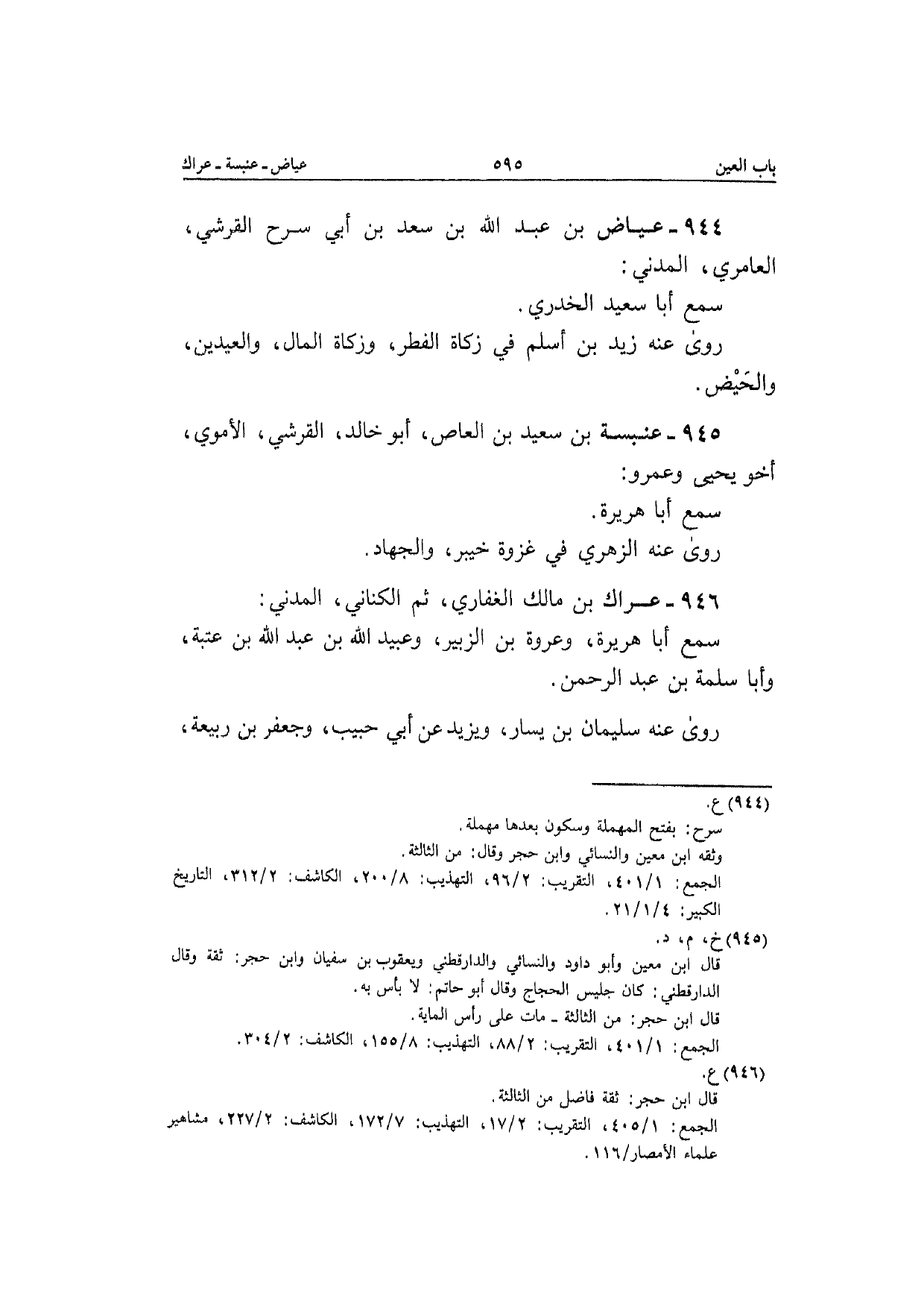 946 - عرَاك بن مَالك الْغِفَارِيّ ثمَّ الْكِنَانِي الْمدنِي سمع أَبَا هُرَيْرَة وَعُرْوَة بن الزبير وَعبيد الله بن عبد الله بن عتبَة وَأَبا سَلمَة بن عبد الرَّحْمَن رَوَى عَنهُ سُلَيْمَان بن يسَار وَيزِيد عَن أبي حبيب وجعفر بن ربيعَة