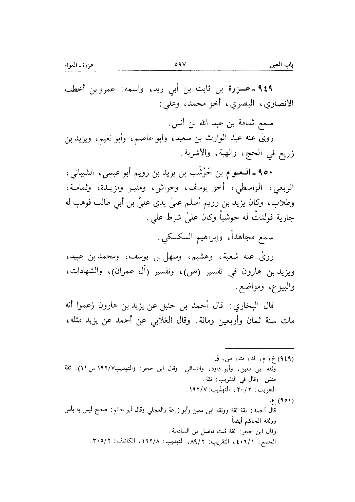 950 - الْعَوام بن حَوْشَب بن يزِيد بن رُوَيْم أَبُو عِيسَى الشَّيْبَانِيّ الربعِي الوَاسِطِيّ أَخُو يُوسُف وحراش ومنير ومزيدة وثمامة وطلاب وَكَانَ يزِيد بن رُوَيْم اسْلَمْ عَلَى يَدي عَلّي بن أبي طَالب فوهب لَهُ جَارِيَة فَولدت لَهُ حوشبا وَكَانَ عَلَى شَرط عَلّي سمع مُجَاهدًا وَإِبْرَاهِيم السكْسكِي رَوَى عَنهُ شُعْبَة وهشيم وَسَهل بن يُوسُف وَمُحَمّد بن عبيد وَيزِيد بن هَارُون فِي تَفْسِير (ص) وَتَفْسِير (آل عمرَان) والشهادات والبيوع ومواضع قَالَ البُخَارِيّ قَالَ أَحْمد بن حَنْبَل عَن يزِيد بن هَارُون زَعَمُوا أَنه مَاتَ سنة ثَمَان وَأَرْبَعين وَمِائَة وَقَالَ الْغلابِي عَن أَحْمد عَن يزِيد مثله