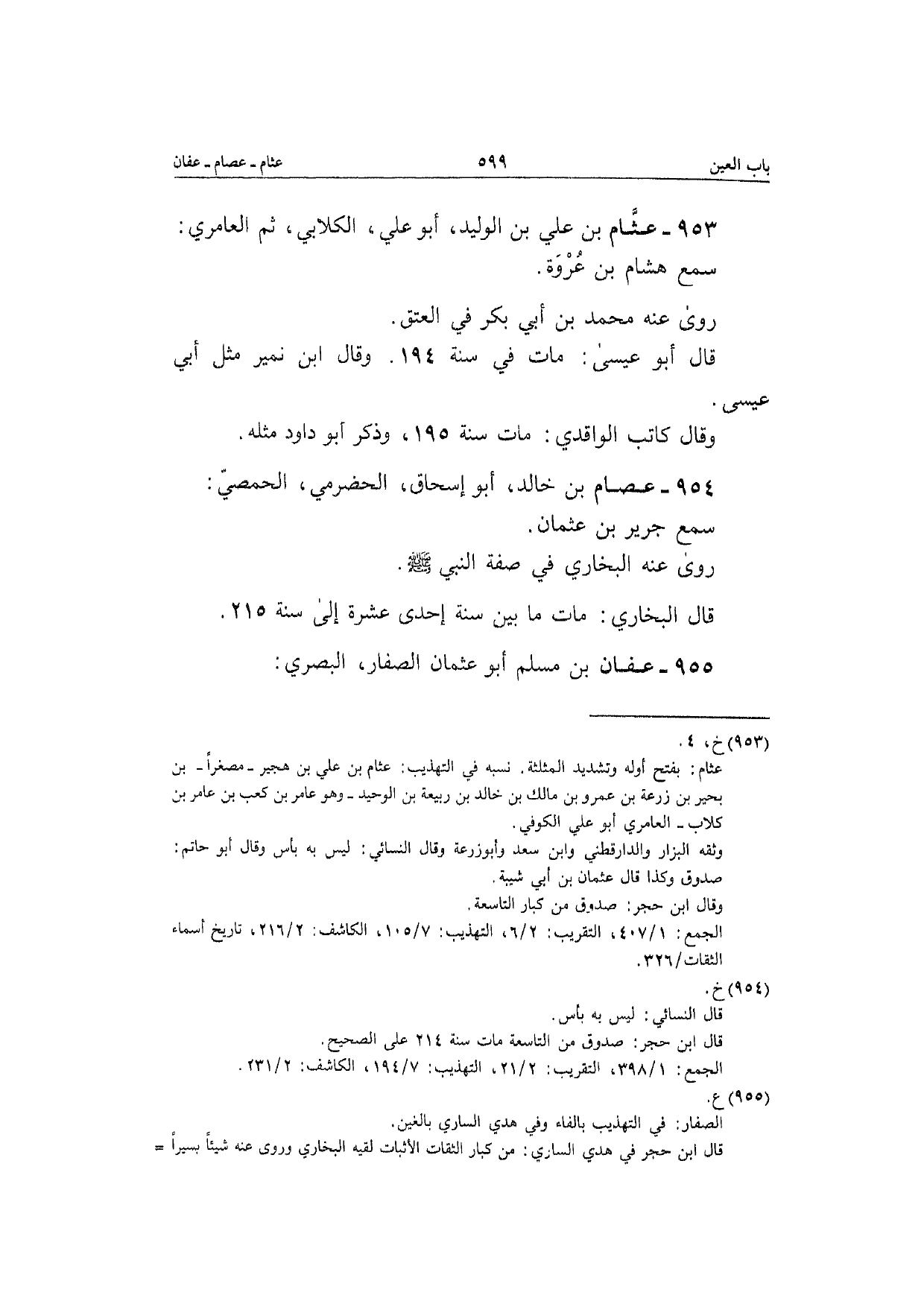954 - عِصَام بن خَالِد أَبُو إِسْحَاق الْحَضْرَمِيّ الْحِمصِي سمع جرير بن عُثْمَان رَوَى عَنهُ البُخَارِيّ فِي صفة النَّبِي صَلَّى الله عَلَيْهِ وَسلم قَالَ البُخَارِيّ مَاتَ مَا بَين سنة إِحْدَى عشرَة إِلَى سنة 215
