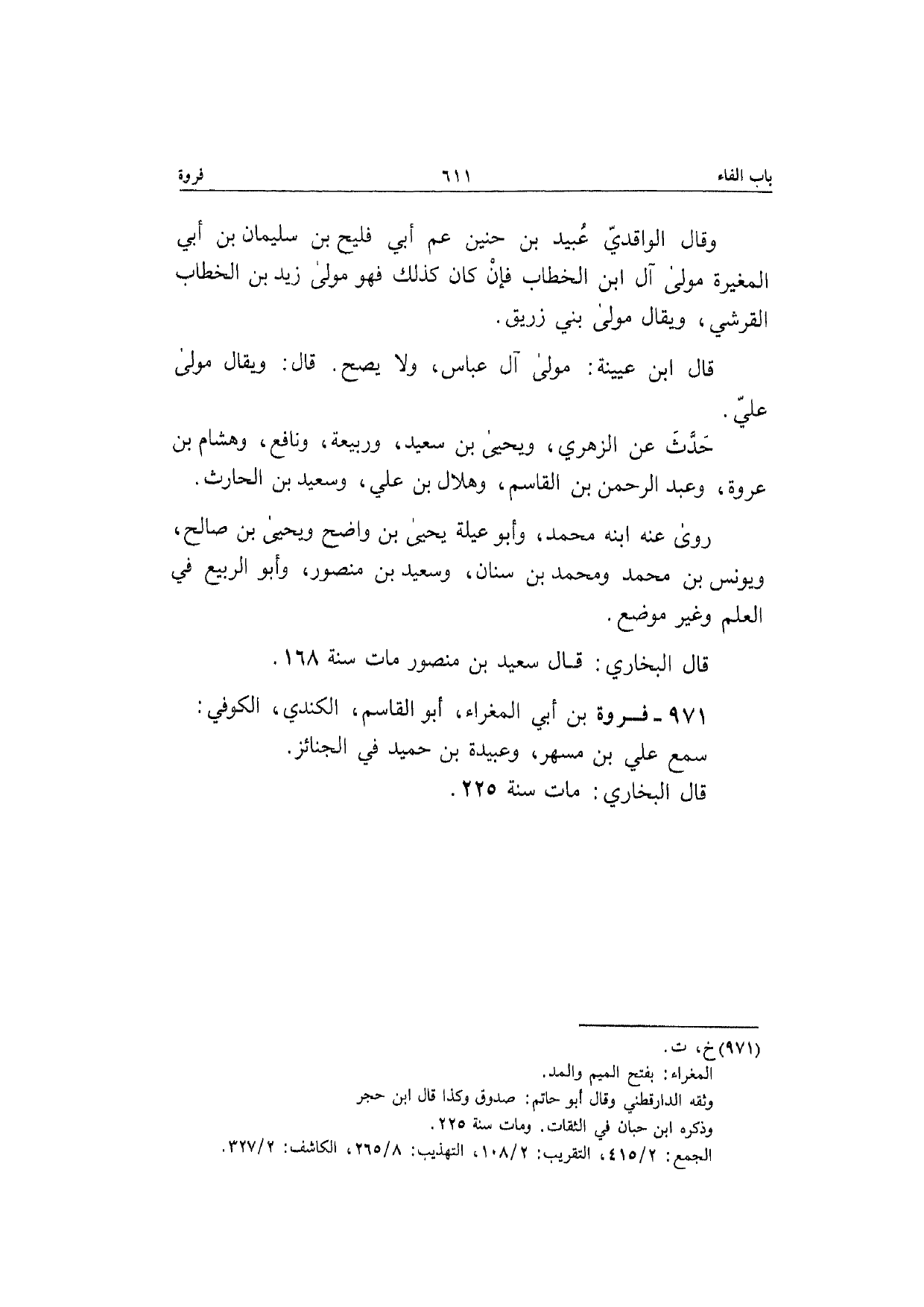 971 - فَرْوَة بن أبي المغراء أَبُو الْقَاسِم الْكِنْدِيّ الْكُوفِي سمع عَلّي بن مسْهر وَعبيدَة بن حميد فِي الْجَنَائِز قَالَ البُخَارِيّ مَاتَ سنة 225
