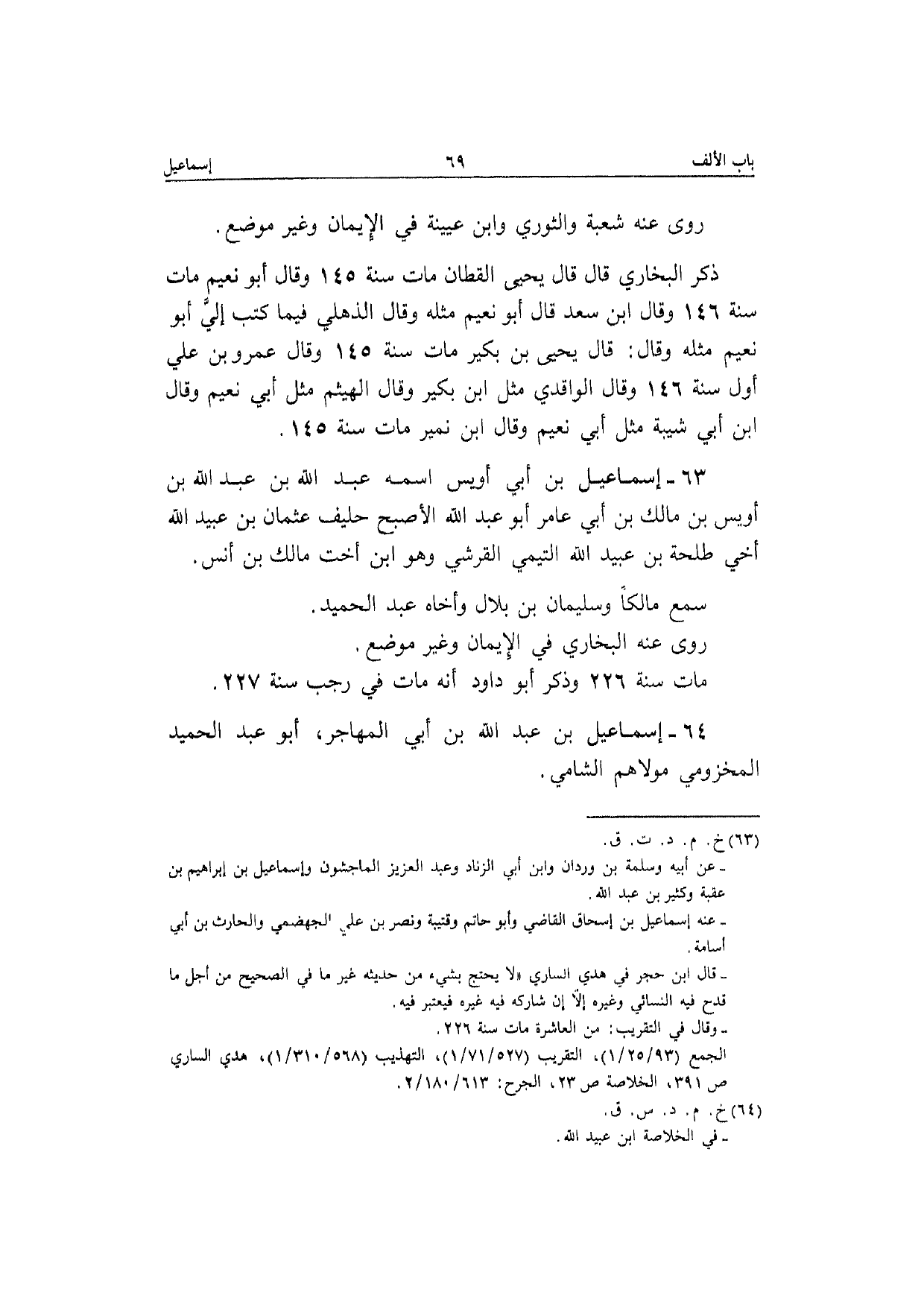 63 - إِسْمَاعِيل بن أبي أويس اسْمه عبد الله بن عبد الله بن أويس بن مَالك بن أبي عَامر أَبُو عبد الله الأصبح حَلِيف عُثْمَان بن عبيد أخي طَلْحَة بن عبيد الله التَّيْمِيّ الْقرشِي وَهُوَ ابْن أُخْت مَالك بن أنس سمع مَالِكًا وَسليمَان بن بِلَال وأخاه عبد الحميد رَوَى عَنهُ البُخَارِيّ فِي الْإِيمَان وَغير مَوضِع مَاتَ سنة 226 وَذكر أَبُو دَاوُد أَنه مَاتَ فِي رَجَب سنة 227