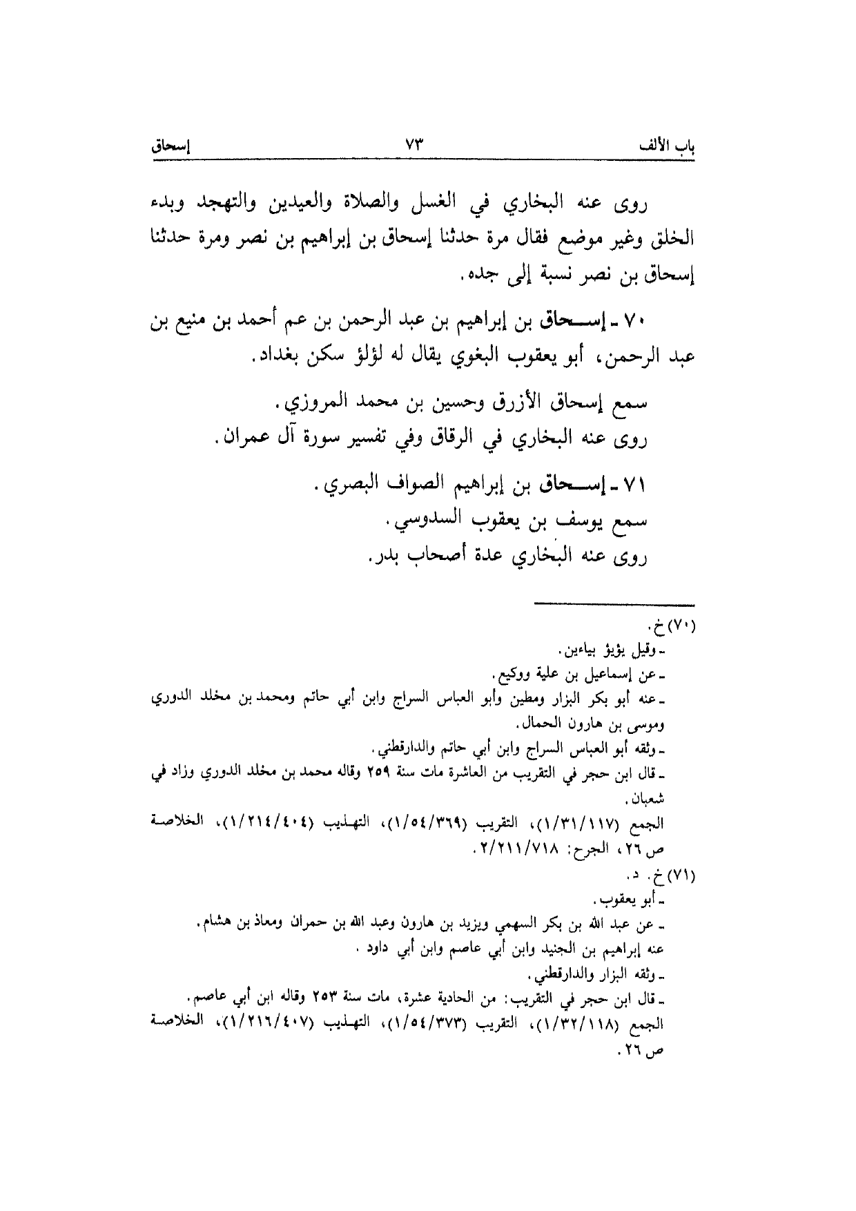 71 - إِسْحَاق بن إِبْرَاهِيم الصَّواف الْبَصْرِيّ سمع يُوسُف بن يَعْقُوب السدُوسِي رَوَى عَنهُ البُخَارِيّ عدَّة أَصْحَاب بدر