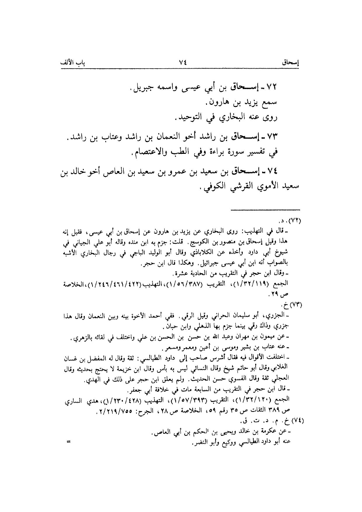 72 - إِسْحَاق بن أبي عِيسَى واسْمه جِبْرِيل سمع يزِيد بن هَارُون رَوَى عَنهُ البُخَارِيّ فِي التَّوْحِيد