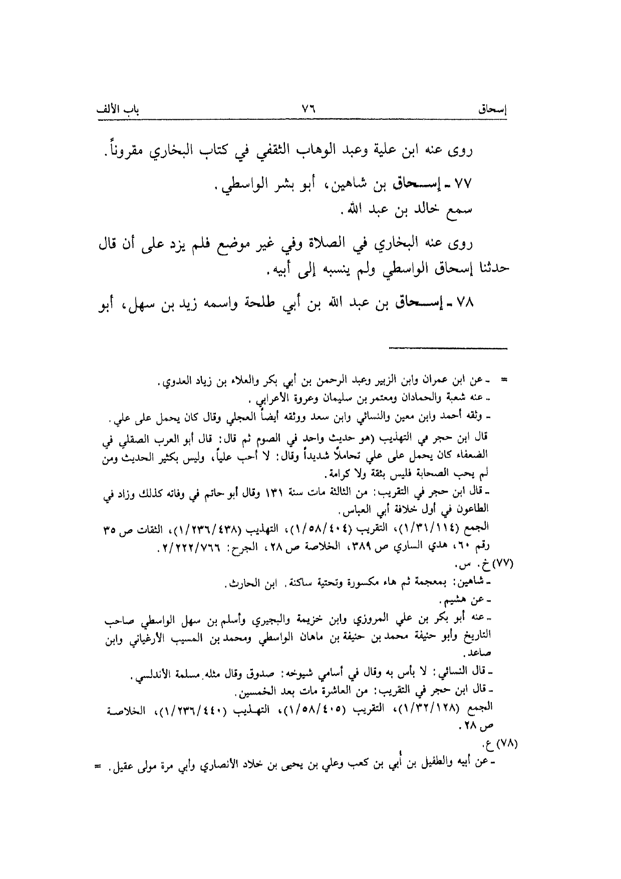 77 - إِسْحَاق بن شاهين أَبُو بشر الوَاسِطِيّ سمع خَالِد بن عبد الله رَوَى عَنهُ البُخَارِيّ فِي الصَّلَاة وَفِي غير مَوضِع فَلم يزدْ عَلَى أَن قَالَ حَدثنَا إِسْحَاق الوَاسِطِيّ وَلم ينْسبهُ إِلَى أَبِيه