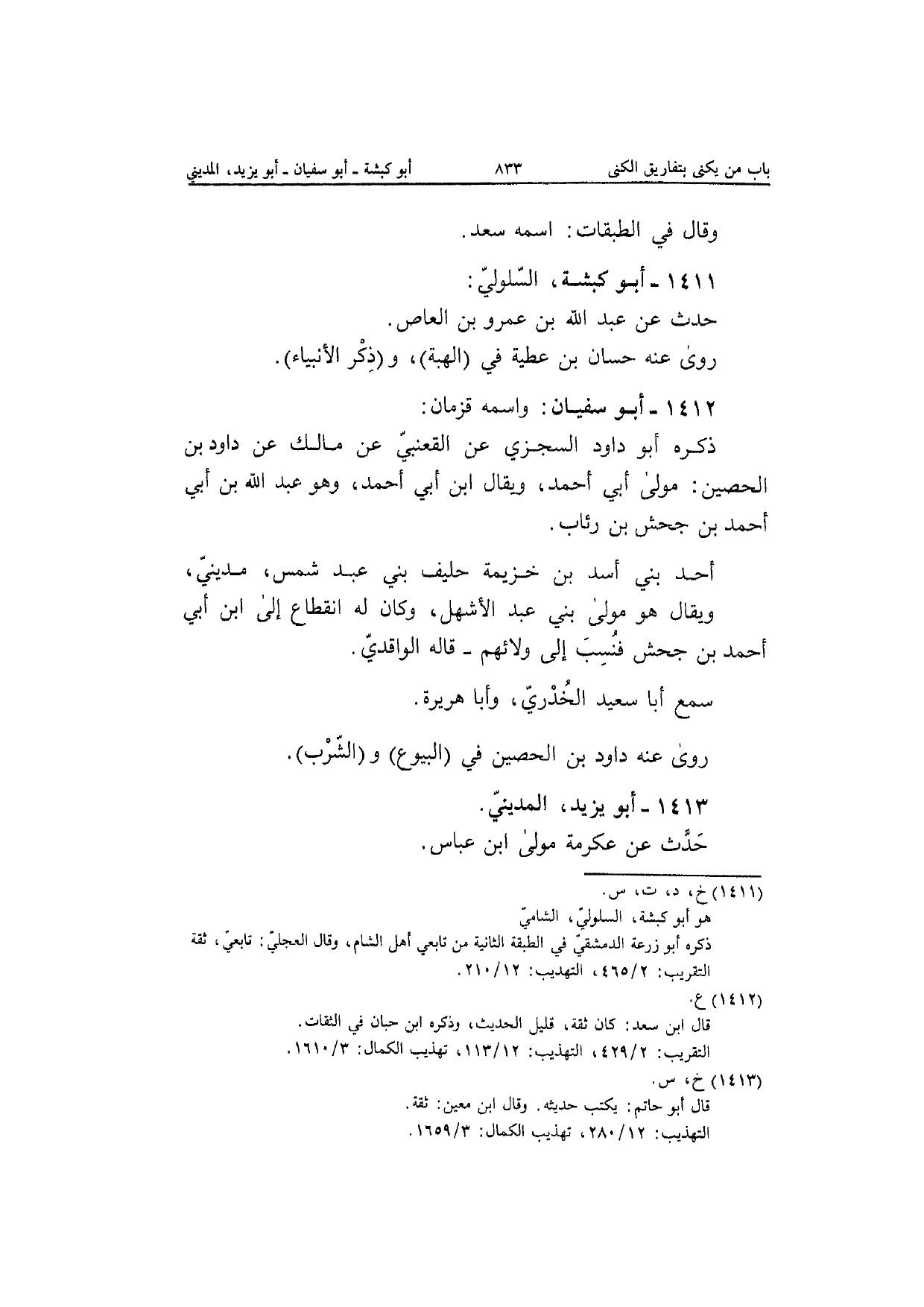 1412 - أَبُو سُفْيَان واسْمه قزمان ذكره أَبُو دَاوُد السجْزِي عَن القعْنبِي عَن مَالك عَن دَاوُد بن الْحصين مولَى أبي أَحْمد وَيُقَال ابْن أبي أَحْمد وَهُوَ عبد الله بن أبي أَحْمد بن جحش بن رِئَاب أحد بني أَسد بن خُزَيْمَة حَلِيف بني عبد شمس مديني وَيُقَال هُوَ مولَى بني عبد الْأَشْهَل وَكَانَ لَهُ انْقِطَاع إِلَى ابْن أبي أَحْمد بن جحش فنسب إِلَى ولائهم قَالَه الْوَاقِدِيّ سمع أَبَا سعيد الْخُدْرِيّ وَأَبا هُرَيْرَة رَوَى عَنهُ دَاوُد بن الْحُسَيْن فِي الْبيُوع وَالشرب