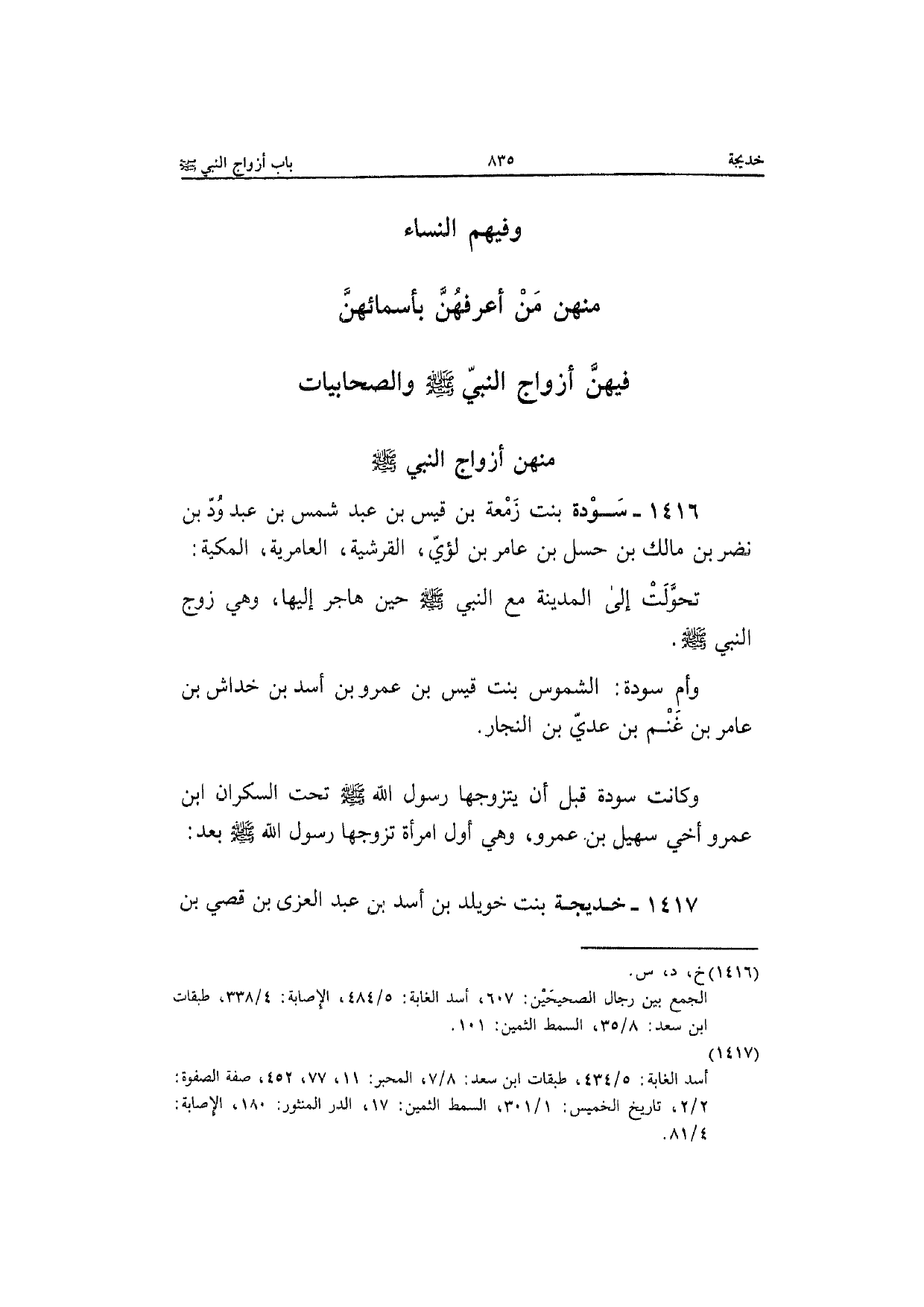 1416 - سَوْدَة بنت زَمعَة بن قيس بن عبد شمس بن عبد ود بن نضر بن مَالك بن حسل بن عَامر بن لؤَي القرشية العامرية المكية تحولت إِلَى الْمَدِينَة مَعَ النَّبِي صَلَّى الله عَلَيْهِ وَسلم حِين هَاجر إِلَيْهَا وَهِي زوج النَّبِي صَلَّى الله عَلَيْهِ وَسلم وَأم سَوْدَة الشموس بنت قيس بن عَمْرو بن أَسد بن خِدَاش بن عَامر بن غنم بن عدي بن النجار وَكَانَت سَوْدَة قبل أَن يَتَزَوَّجهَا رَسُول الله صَلَّى الله عَلَيْهِ وَسلم تَحت السَّكْرَان ابْن عَمْرو أخي سُهَيْل بن عَمْرو وَهِي أول امْرَأَة تزَوجهَا رَسُول الله صَلَّى الله عَلَيْهِ وَسلم بعد