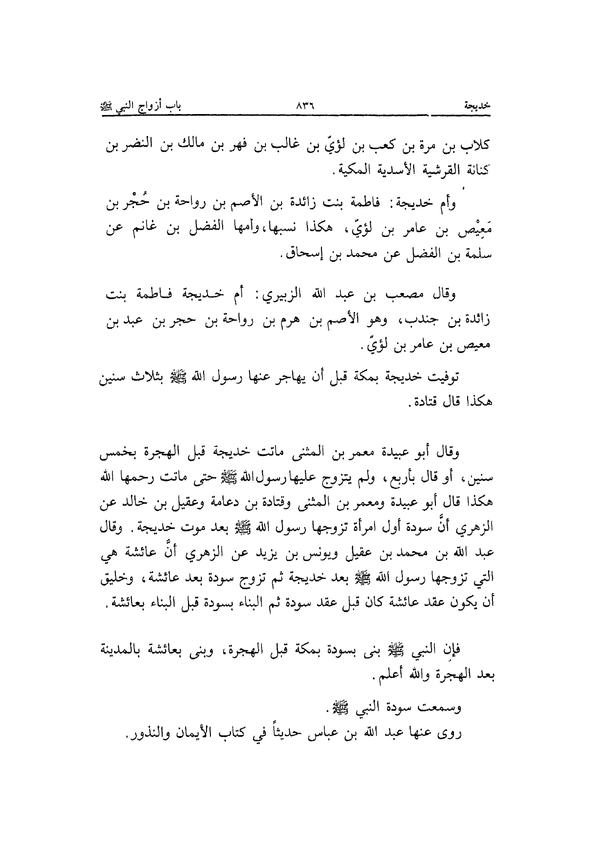 كلاب بن مرّة بن كَعْب بن لؤَي بن غَالب بن فهر بن مَالك بن النَّضر بن كنَانَة القرشية الأَسدِية المكية وَأم خَدِيجَة فَاطِمَة بنت زَائِدَة بن الْأَصَم بن رَوَاحَة بن حجر بن معيص بن عَامر بن لؤَي هَكَذَا نَسَبهَا وَأمّهَا الْفضل بن غَانِم عَن سَلمَة بن الْفضل عَن مُحَمَّد بن إِسْحَاق وَقَالَ مُصعب بن عبد الله الزبيرِي أم خَدِيجَة فَاطِمَة بنت زَائِدَة بن جُنْدُب وَهُوَ الْأَصَم بن هرم بن رَوَاحَة بن حجر بن عبد بن معيص بن عَامر بن لؤَي توفيت خَدِيجَة بِمَكَّة قبل أَن يُهَاجر عَنْهَا رَسُول الله صَلَّى الله عَلَيْهِ وَسلم بِثَلَاث سِنِين هَكَذَا قَالَ قَتَادَة وَقَالَ أَبُو عُبَيْدَة معمر بن الْمثنى مَاتَت خَدِيجَة قبل الْهِجْرَة بِخمْس سِنِين أَو قَالَ بِأَرْبَع وَلم يتَزَوَّج عَلَيْهَا رَسُول الله صَلَّى الله عَلَيْهِ وَسلم حَتَّى مَاتَت رَحمهَا الله هَكَذَا قَالَ أَبُو عُبَيْدَة وَمعمر بن الْمثنى قَتَادَة بن دعامة وَعقيل بن خَالِد عَن الزُّهْرِيّ أَن سَوْدَة أول امْرَأَة تزَوجهَا رَسُول الله صَلَّى الله عَلَيْهِ وَسلم بعد موت خَدِيجَة وَقَالَ عبد الله بن مُحَمَّد بن عقيل وَيُونُس بن يزِيد عَن الزُّهْرِيّ أَن عَائِشَة هِيَ الَّتِي تزَوجهَا رَسُول الله صَلَّى الله عَلَيْهِ وَسلم بعد خَدِيجَة ثمَّ تزوج سَوْدَة بعد عَائِشَة وخليق أَن يكون عقد عَائِشَة كَانَ قبل عقد سَوْدَة ثمَّ الْبناء بسودة قبل الْبناء بعائشة فَإِن النَّبِي صَلَّى الله عَلَيْهِ وَسلم بنى بسودة بِمَكَّة قبل الْهِجْرَة وَبَنَى بعائشة بِالْمَدِينَةِ بعد الْهِجْرَة وَالله أعلم وَسمعت سَوْدَة النَّبِي صَلَّى الله عَلَيْهِ وَسلم رَوَى عَنْهَا عبد الله بن عَبَّاس حَدِيثا فِي كتاب الْأَيْمَان وَالنُّذُور