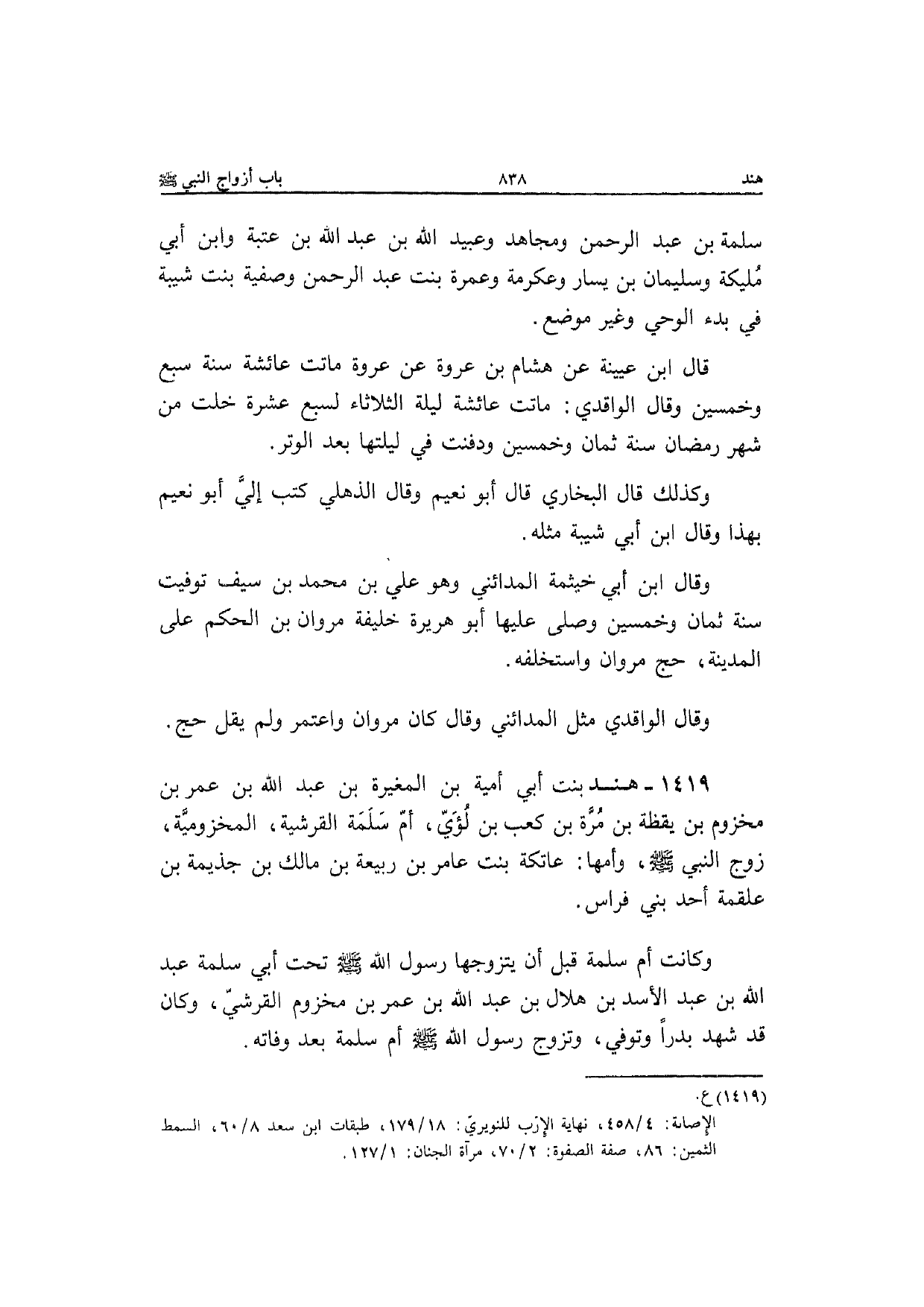 1419 - هِنْد بنت أبي أُميَّة بن الْمُغيرَة بن عبد الله بن عمر بن مَخْزُوم بن يقظة بن مرّة بن كَعْب بن لؤَي أم سَلمَة القرشية المخزومية زوج النَّبِي صَلَّى الله عَلَيْهِ وَسلم وَأمّهَا عَاتِكَة بنت عَامر بن ربيعَة بن مَالك بن جذيمة بن عَلْقَمَة أحد بني فراس وَكَانَت أم سَلمَة قبل أَن يَتَزَوَّجهَا رَسُول الله صَلَّى الله عَلَيْهِ وَسلم تَحت أبي سَلمَة عبد الله بن عبد الْأسد بن هِلَال بن عبد الله بن عمر بن مَخْزُوم الْقرشِي وَكَانَ قد شهد بَدْرًا وَتُوفِّي وَتزَوج رَسُول الله صَلَّى الله عَلَيْهِ وَسلم أم سَلمَة بعد وَفَاته