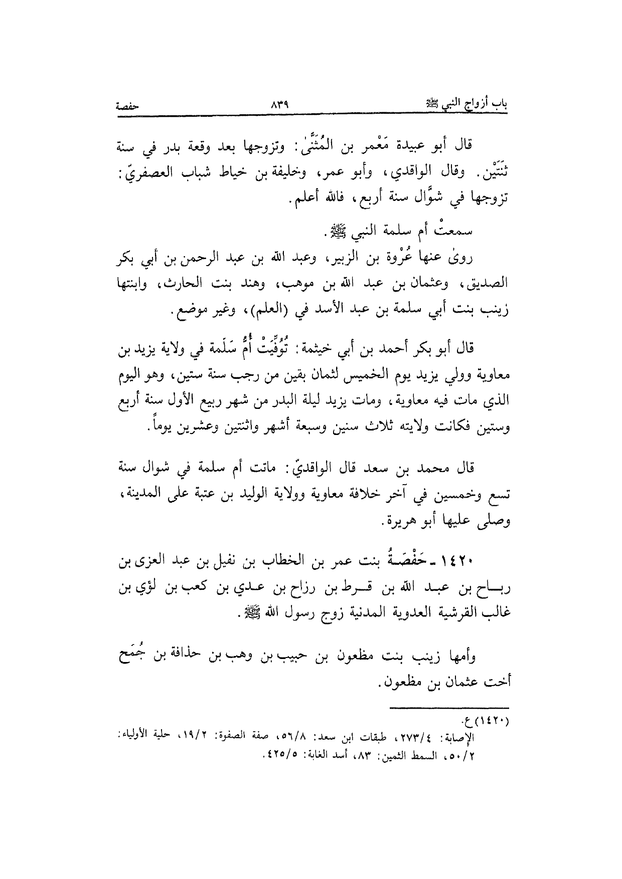 1420 - حَفْصَة بنت عمر بن الْخطاب بن نفَيْل بن عبد الْعُزَّى بن رَبَاح بن عبد الله بن قرط بن رزاح بن عدي بن كَعْب بن لؤَي بن غَالب القرشية العدوية المدنية زوج رَسُول الله صَلَّى الله عَلَيْهِ وَسلم وَأمّهَا زَيْنَب بنت مَظْعُون بن حبيب بن وهب بن حذافة بن جمح أُخْت عُثْمَان بن مَظْعُون