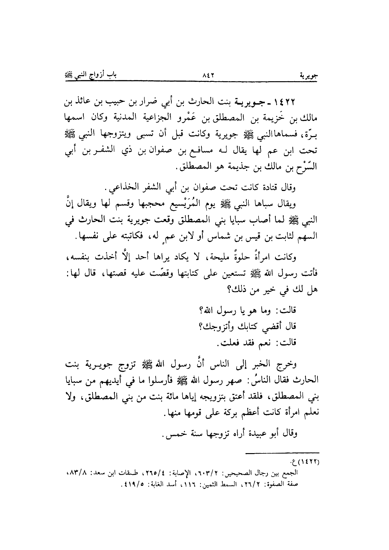 1422 - جوَيْرِية بنت الْحَارِث بن أبي ضرار بن حبيب بن عَائِذ بن مَالك بن خُزَيْمَة بن المصطلق بن عَمْرو الجزاعية المدنية وَكَانَ اسْمهَا برة فسماها النَّبِي صَلَّى الله عَلَيْهِ وَسلم جوَيْرِية وَكَانَت قبل أَن تسبى ويتزوجها النَّبِي صَلَّى الله عَلَيْهِ وَسلم تَحت ابْن عَم لَهَا يُقَال لَهُ مسافع بن صَفْوَان بن ذِي الشفر بن أبي السَّرْح بن مَالك بن جذيمة هُوَ المصطلق وَقَالَ قَتَادَة كَانَت تَحت صَفْوَان بن أبي الشفر الخذاعي وَيُقَال سباها النَّبِي صَلَّى الله عَلَيْهِ وَسلم يَوْم الْمُريْسِيع وحجبها وَقسم لَهَا وَيُقَال إِن النَّبِي صَلَّى الله عَلَيْهِ وَسلم لما أصَاب سَبَايَا بني المصطلق وَقعت جوَيْرِية بنت الْحَارِث فِي السهْم لِثَابِت بن قيس بن شماس أَو لِابْنِ عَم لَهُ فكاتبته عَلَى نَفسهَا وَكَانَ امْرَأَة حلوة مليحة لَا يكَاد يَرَاهَا أحد إِلَّا أخذت بِنَفسِهِ فَأَتَت رَسُول الله صَلَّى الله عَلَيْهِ وَسلم تستعين عَلَى كتَابَتهَا وقصت عَلَيْهِ قصَّتهَا قَالَ لَهَا هَل لَك فِي خير من ذَلِك قَالَت وَمَا هُوَ يَا رَسُول الله قَالَ أَقْْضِي كتابك وأتزوجك قَالَت نعم فقد فعلت وَخرج الْخَبَر إِلَى النَّاس أَن رَسُول الله صَلَّى الله عَلَيْهِ وَسلم تزوج جوَيْرِية بنت الْحَارِث فَقَالَ النَّاس صهر رَسُول الله صَلَّى الله عَلَيْهِ وَسلم فأرسلوا مَا فِي أَيْديهم من سَبَايَا بني المصطلق فَلَقَد أعتق بتزويجه إِيَّاهَا مائَة بنت من بني المصطلق وَلَا نعلم امْرَأَة كَانَت أعظم بركَة عَلَى قَومهَا مِنْهَا وَقَالَ أَبُو عُبَيْدَة أرَاهُ تزَوجهَا سنة خمس