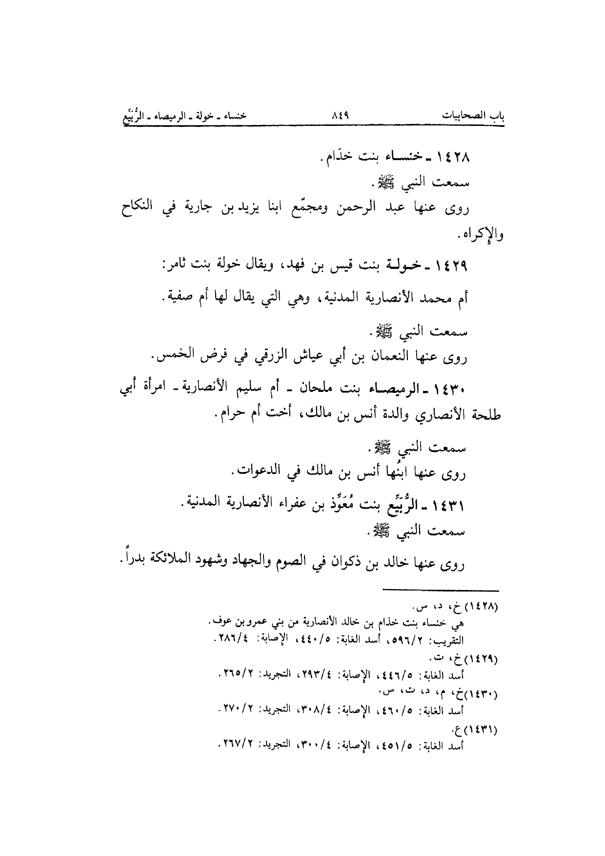 1431 - الرّبيع بنت معوذ بن عفراء الْأَنْصَارِيَّة المدنية سَمِعت النَّبِي صَلَّى الله عَلَيْهِ وَسلم رَوَى عَنْهَا خَالِد بن ذكْوَان فِي الصَّوْم وَالْجهَاد وشهود الْمَلَائِكَة بَدْرًا