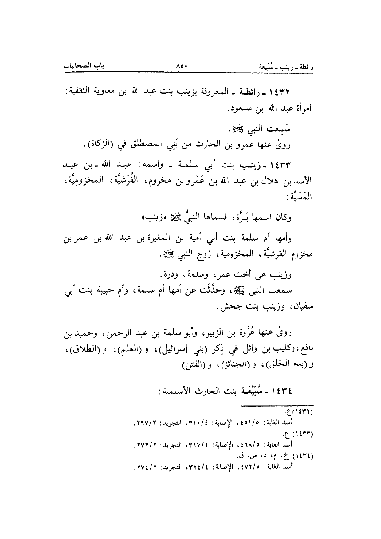 1432 - رائطة الْمَعْرُوفَة بِزَيْنَب بنت عبد الله بن مُعَاوِيَة الثقفية امْرَأَة عبد الله بن مَسْعُود سَمِعت النَّبِي صَلَّى الله عَلَيْهِ وَسلم رَوَى عَنْهَا عَمْرو بن الْحَارِث من بني المصطلق فِي (الزَّكَاة)