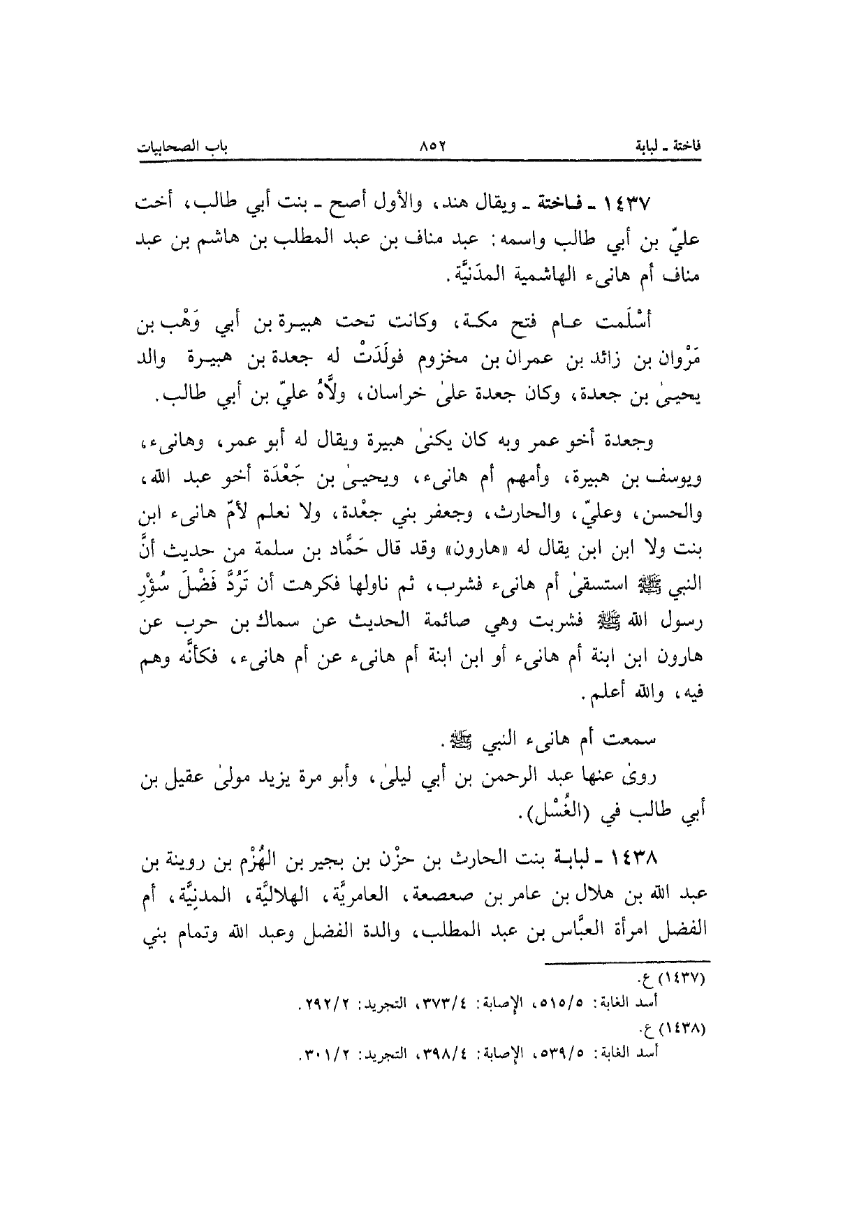 1437 - فَاخِتَة وَيُقَال هِنْد وَالْأول أصح بنت أبي طَالب أُخْت عَلّي بن أبي طَالب واسْمه عبد منَاف بن عبد الْمطلب بن هَاشم بن عبد منَاف أم هَانِئ الهاشمية المدنية أسلمت عَام فتح مَكَّة وَكَانَت تَحت هُبَيْرَة بن أبي وهب بن مَرْوَان بن زَائِد بن عمرَان بن مَخْزُوم فَولدت لَهُ جعدة بن هُبَيْرَة وَالِد يَحْيَى بن جعدة وَكَانَ جعدة عَلَى خُرَاسَان ولاه عَلّي بن أبي طَالب وجعدة أَخُو عمر وَبِه كَانَ يكنى هُبَيْرَة وَيُقَال لَهُ أَبُو عمر وهانئ ويوسف بن هُبَيْرَة وأمهم أم هَانِئ وَيَحْيَى بن جعدة أَخُو عبد الله وَالْحسن وَعلي والْحَارث وجعفر بني جعدة وَلَا نعلم لأم هَانِئ ابْن بنت وَلَا ابْن ابْن يُقَال لَهُ هَارُون وَقد قَالَ حَمَّاد بن سَلمَة من حَدِيث أَن النَّبِي صَلَّى الله عَلَيْهِ وَسلم استسقى أم هَانِئ فَشرب ثمَّ ناولها فَكرِهت أَن ترد فضل سُؤْر رَسُول الله صَلَّى الله عَلَيْهِ وَسلم فَشَرِبت وَهِي صَائِمَة الحَدِيث عَن سماك بن حَرْب عَن هَارُون ابْن ابْنة أم هَانِئ أَو ابْن ابْنة أم هَانِئ عَن أم هَانِئ فَكَأَنَّهُ وهم فِيهِ وَالله أعلم سَمِعت أم هَانِئ النَّبِي صَلَّى الله عَلَيْهِ وَسلم رَوَى عَنْهَا عبد الرَّحْمَن بن أبي لَيْلَى وَأَبُو مرّة يزِيد مولَى عقيل بن أبي طَالب فِي الْغسْل