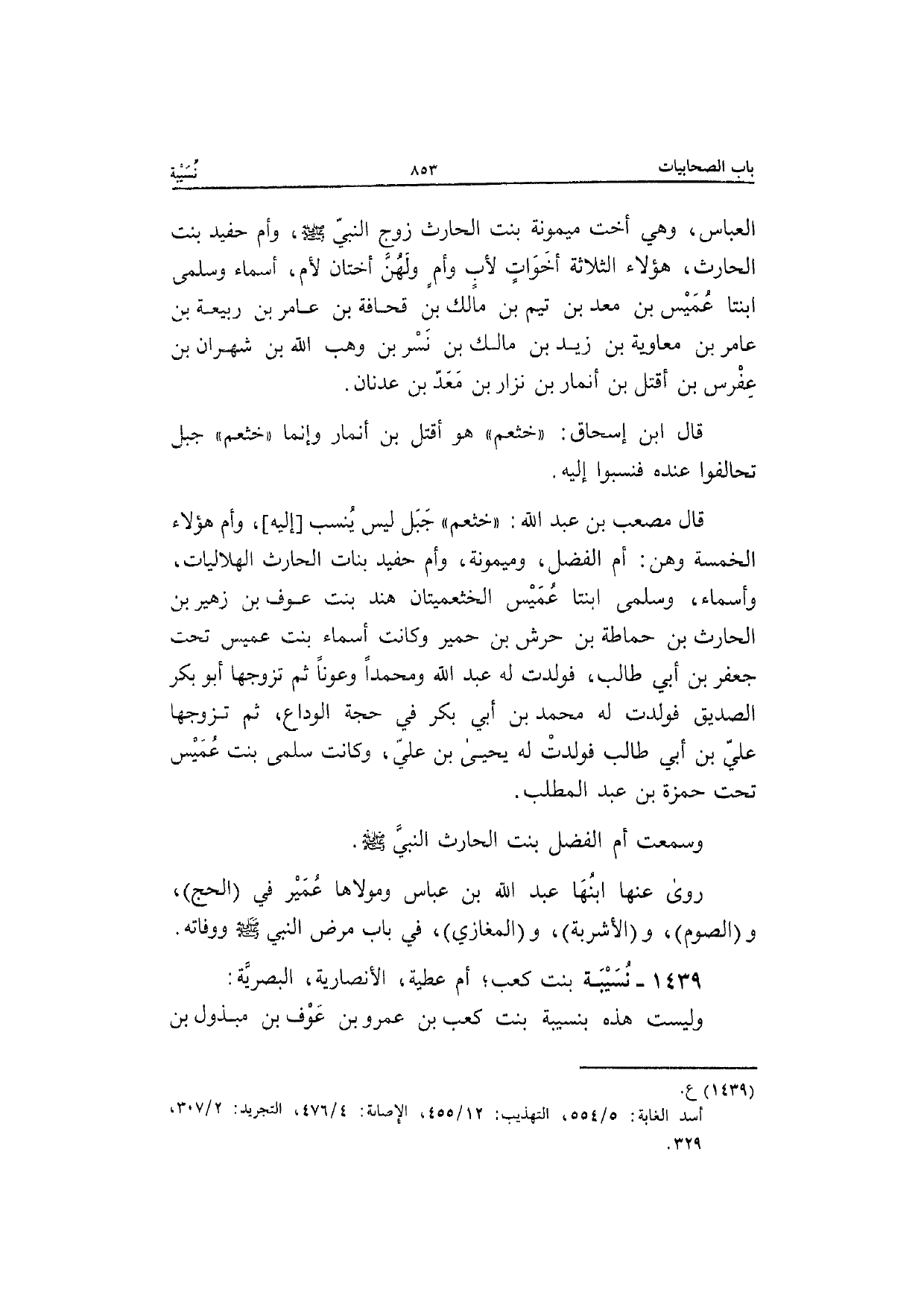 الْعَبَّاس وَهِي أُخْت مَيْمُونَة بنت الْحَارِث زوج النَّبِي صَلَّى الله عَلَيْهِ وَسلم وَأم حفيد بنت الْحَارِث هَؤُلَاءِ الثَّلَاثَة أَخَوَات لأَب وَأم ولهن أختَان لأم أَسمَاء وسلمى ابنتا عُمَيْس بن معد بن تيم بن مَالك بن قُحَافَة بن عَامر بن ربيعَة بن عَامر بن مُعَاوِيَة بن زيد بن مَالك بن نسر بن وهب الله بن شَهْرَان بن عفرس بن أقتل بن أَنْمَار بن نزار بن معد بن عدنان قَالَ بن إِسْحَاق خثعم هُوَ أقتل بن أَنْمَار وَإِنَّمَا خثعم جبل تحالفوا عِنْده فنسبوا إِلَيْهِ قَالَ مُصعب بن عبد الله خثعم جبل لَيْسَ ينْسب إِلَيْهِ وَأم هَؤُلَاءِ الْخَمْسَة وَهن أم الْفضل ومَيْمُونَة وَأم حفيد بَنَات الْحَارِث الهلاليات وَأَسْمَاء وسلمى ابنتا عُمَيْس الخثعميتان هِنْد بنت عَوْف بن زُهَيْر بن الْحَارِث بن حماطة بن حرش بن حمير وَكَانَت أَسمَاء بنت عُمَيْس تَحت جَعْفَر بن أبي طَالب فَولدت لَهُ عبد الله ومحمدا وعونا ثمَّ تزَوجهَا أَبُو بكر الصّديق فَولدت لَهُ مُحَمَّد بن أبي بكر فِي حجَّة الْوَدَاع ثمَّ تزَوجهَا عَلّي بن أبي طَالب فَولدت لَهُ يَحْيَى بن عَلّي وَكَانَت سلْمَى بنت عُمَيْس تَحت حَمْزَة بن عبد الْمطلب وَسمعت أم الْفضل بنت الْحَارِث النَّبِي صَلَّى الله عَلَيْهِ وَسلم رَوَى عَنْهَا ابْنهَا عبد الله بن عَبَّاس ومولاها عُمَيْر فِي الْحَج وَالصَّوْم والأشربة والمغازي فِي بَاب مرض النَّبِي صَلَّى الله عَلَيْهِ وَسلم ووفاته