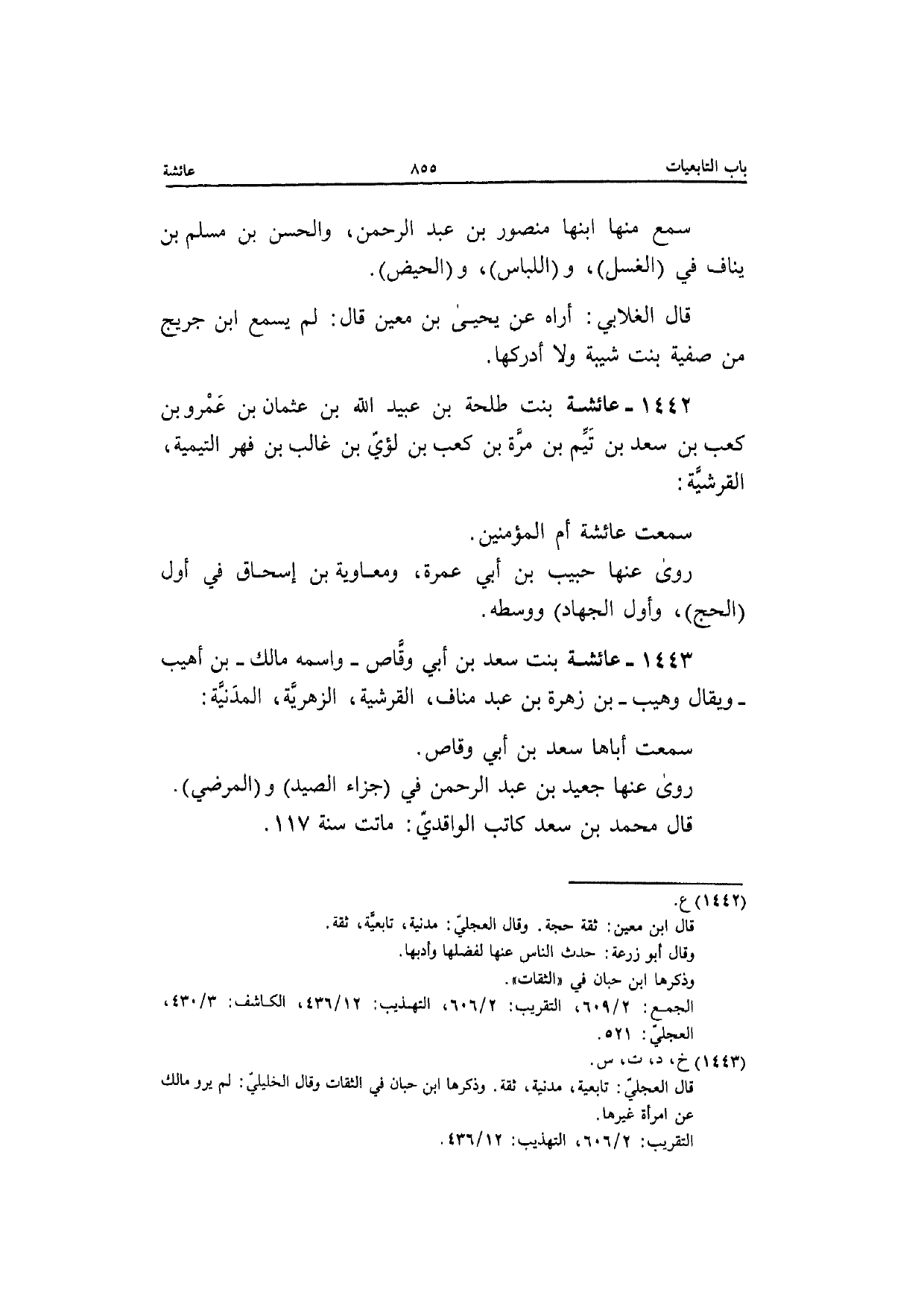 1442 - عَائِشَة بنت طَلْحَة بن عبيد الله بن عُثْمَان بن عَمْرو بن كَعْب بن سعد بن تيم بن مرّة بن كَعْب بن لؤَي بن غَالب بن فهر التيمية القرشية سَمِعت عَائِشَة أم الْمُؤمنِينَ رَوَى عَنْهَا حبيب بن أبي عمْرَة وَمُعَاوِيَة بن إِسْحَاق فِي أول الْحَج وَأول الْجِهَاد ووسطه