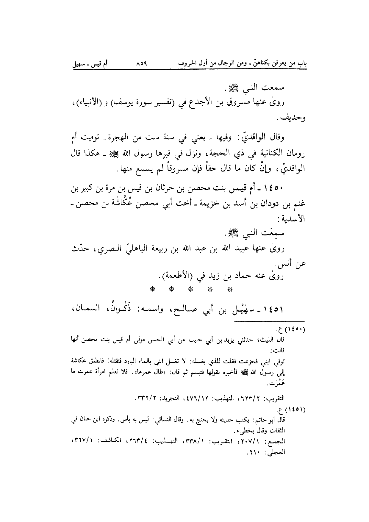 1450 - أم قيس بنت مُحصن بن حرثان بن قيس بن مرّة بن كَبِير بن غنم بن دودان بن أَسد بن خُزَيْمَة أُخْت أبي مُحصن عكاشة بن مُحصن الأَسدِية سَمِعت النَّبِي صَلَّى الله عَلَيْهِ وَسلم رَوَى عَنْهَا عبيد الله بن عبد الله بن ربيعَة الْبَاهِلِيّ الْبَصْرِيّ حدث عَن أنس رَوَى عَنهُ حَمَّاد بن زيد فِي الْأَطْعِمَة
