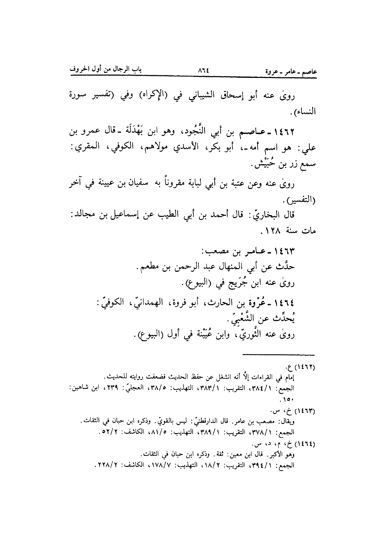 1462 - عَاصِم بن أبي النجُود وَهُوَ ابْن بَهْدَلَة قَالَ عَمْرو بن عَلّي هُوَ اسْم أمه أَبُو بكر الْأَسدي مَوْلَاهُم الْكُوفِي الْمقري سمع زر بن حُبَيْش رَوَى عَنهُ وَعَن عتبَة بن أبي لبَابَة مَقْرُونا بِهِ سُفْيَان بن عُيَيْنَة فِي آخر التَّفْسِير قَالَ البُخَارِيّ قَالَ أَحْمد بن أبي الطّيب عَن إِسْمَاعِيل بن مجَالد مَاتَ سنة 128