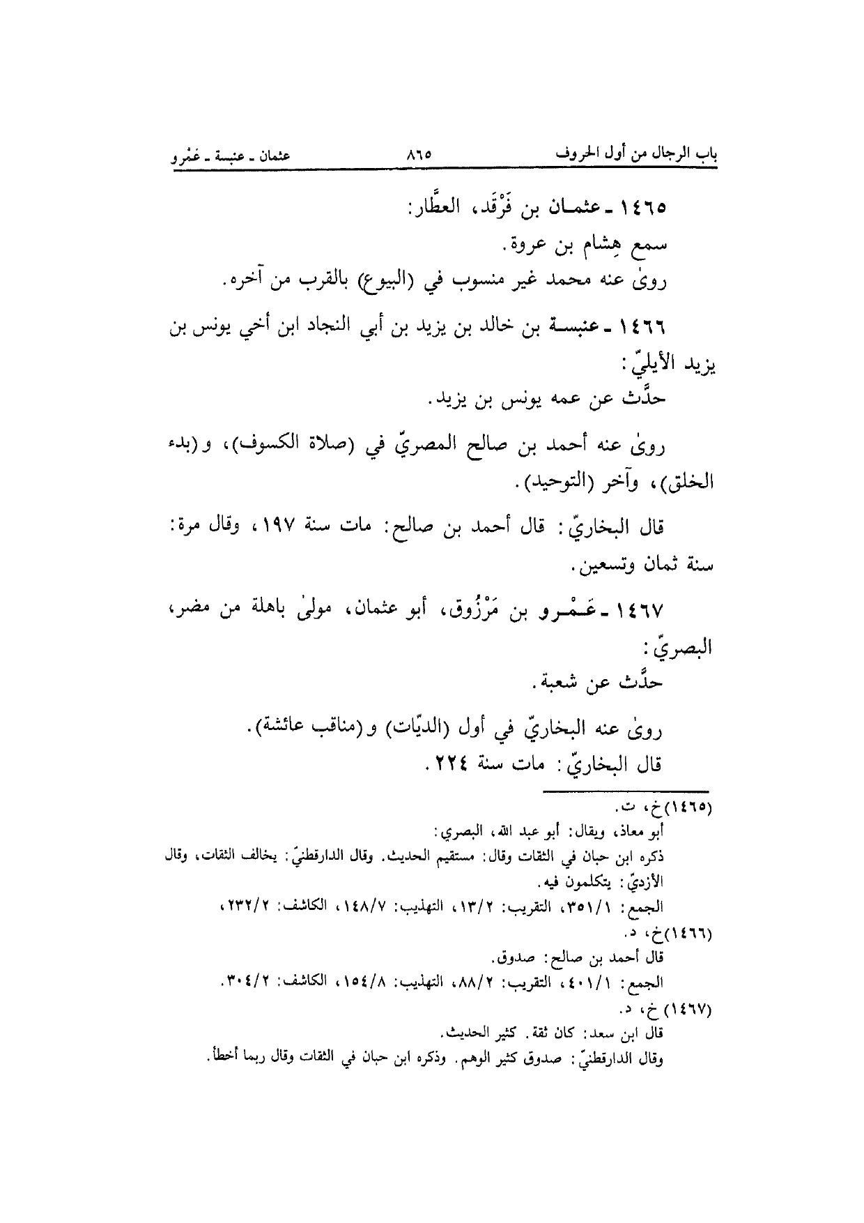 1465 - عُثْمَان بن فرقد الْعَطَّار سمع هِشَام بن عُرْوَة رَوَى عَنهُ مُحَمَّد غير مَنْسُوب فِي الْبيُوع بِالْقربِ من آخِره