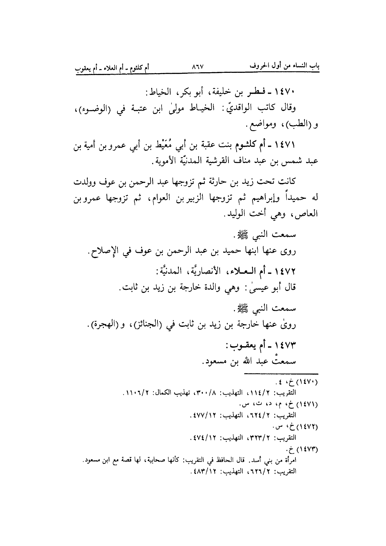 1471 - أم كُلْثُوم بنت عقبَة بن أبي معيط بن أبي عَمْرو بن أُميَّة بن عبدشمس بن عبد منَاف القرشية المدنية الأموية كَانَت تَحت زيد بن حَارِثَة ثمَّ تزَوجهَا عبد الرَّحْمَن بن عَوْف وَولدت لَهُ حميدا وَإِبْرَاهِيم ثمَّ تزَوجهَا الزبير بن الْعَوام ثمَّ تزَوجهَا عَمْرو بن الْعَاصِ وَهِي أُخْت الْوَلِيد سَمِعت النَّبِي صَلَّى الله عَلَيْهِ وَسلم رَوَى عَنْهَا ابْنهَا حميد بن عبد الرَّحْمَن بن عَوْف فِي الْإِصْلَاح
