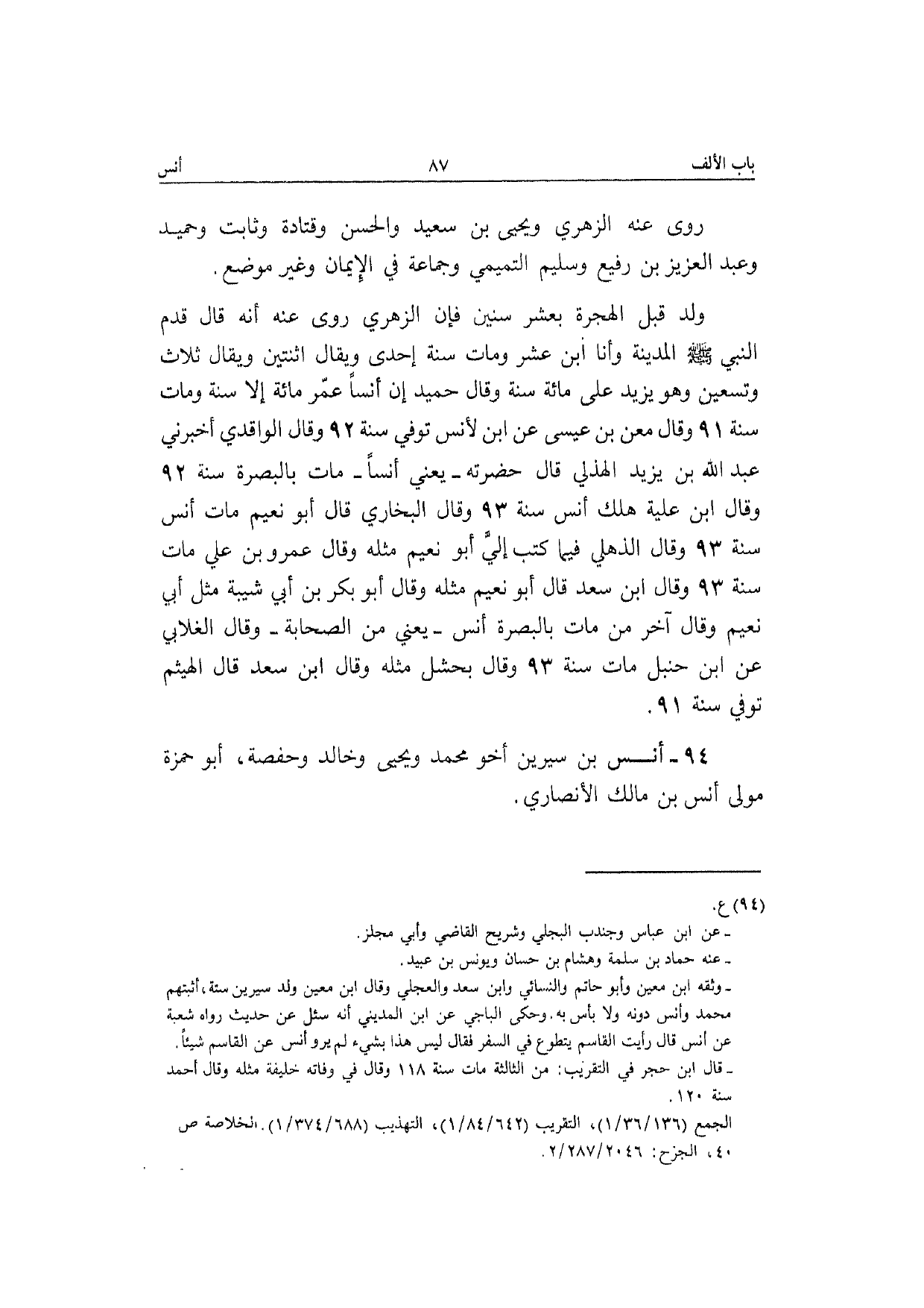 94 - أنس بن سِيرِين أَخُو مُحَمَّد وَيَحْيَى وخَالِد وَحَفْصَة أَبُو حَمْزَة مولَى أنس بن مَالك الْأنْصَارِيّ