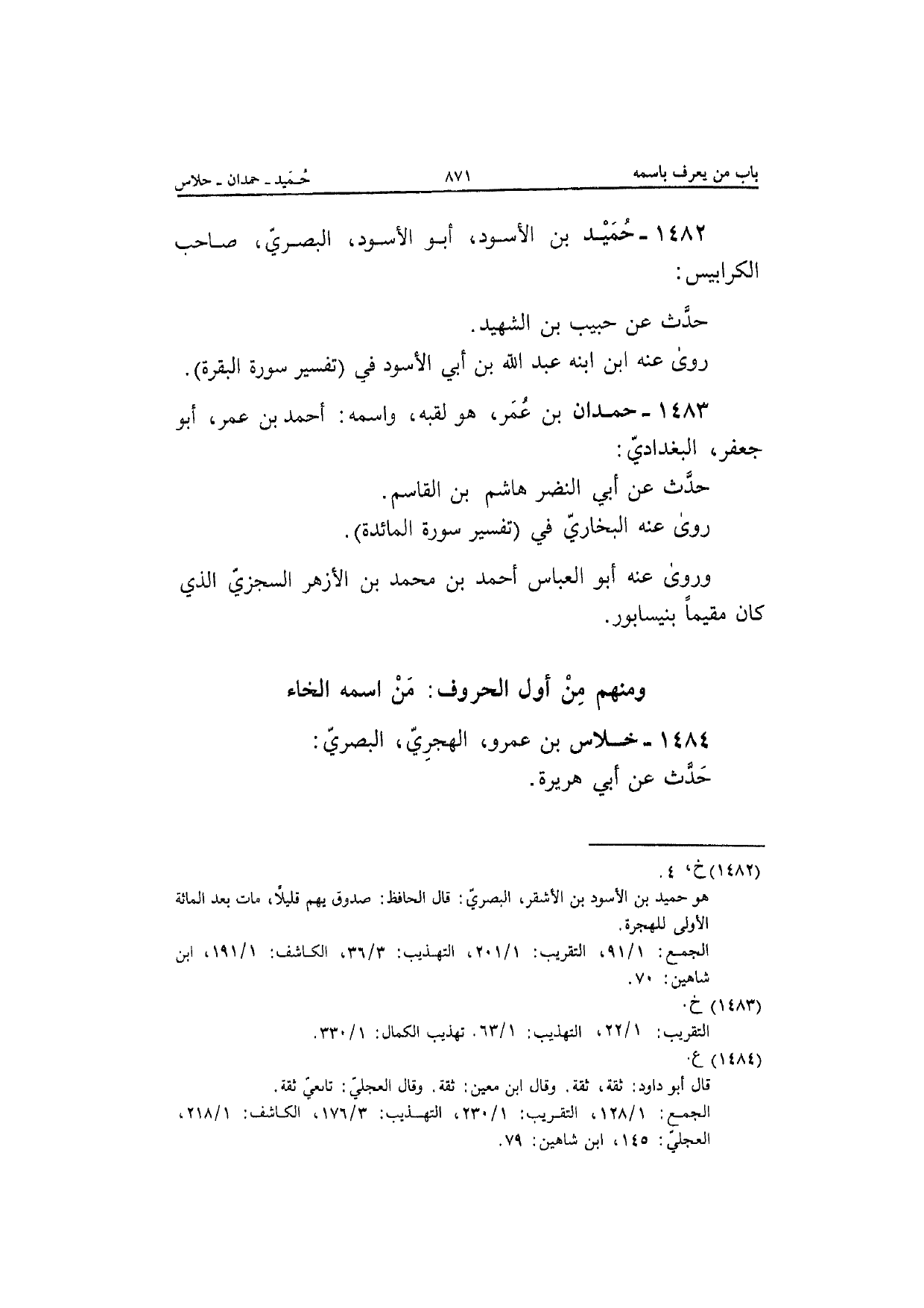 1483 - حمدَان بن عمر هُوَ لقبه واسْمه أَحْمد بن عمر أَبُو جَعْفَر الْبَغْدَادِيّ حدث عَن أبي النَّضر هَاشم بن الْقَاسِم رَوَى عَنهُ البُخَارِيّ فِي تَفْسِير سور الْمَائِدَة وَرَوَى عَنهُ أَبُو الْعَبَّاس أَحْمد بن مُحَمَّد بن الْأَزْهَر السجْزِي الَّذِي كَانَ مُقيما بنيسابور