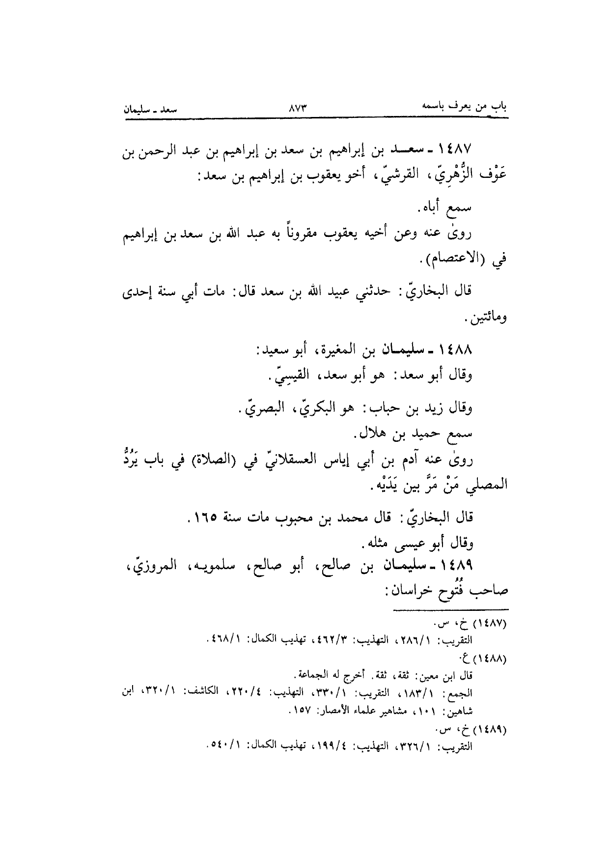 1487 - سعد بن إِبْرَاهِيم بن سعد بن إِبْرَاهِيم بن عبد الرَّحْمَن بن عَوْف الزُّهْرِيّ الْقرشِي أَخُو يَعْقُوب بن إِبْرَاهِيم بن سعد سمع أَبَاهُ رَوَى عَنهُ وَعَن أَخِيه يَعْقُوب مَقْرُونا بِهِ عبد الله بن سعد بن إِبْرَاهِيم فِي الِاعْتِصَام قَالَ البُخَارِيّ حَدثنِي عبيد الله بن سعد قَالَ مَاتَ أبي سنة إِحْدَى وَمِائَتَيْنِ