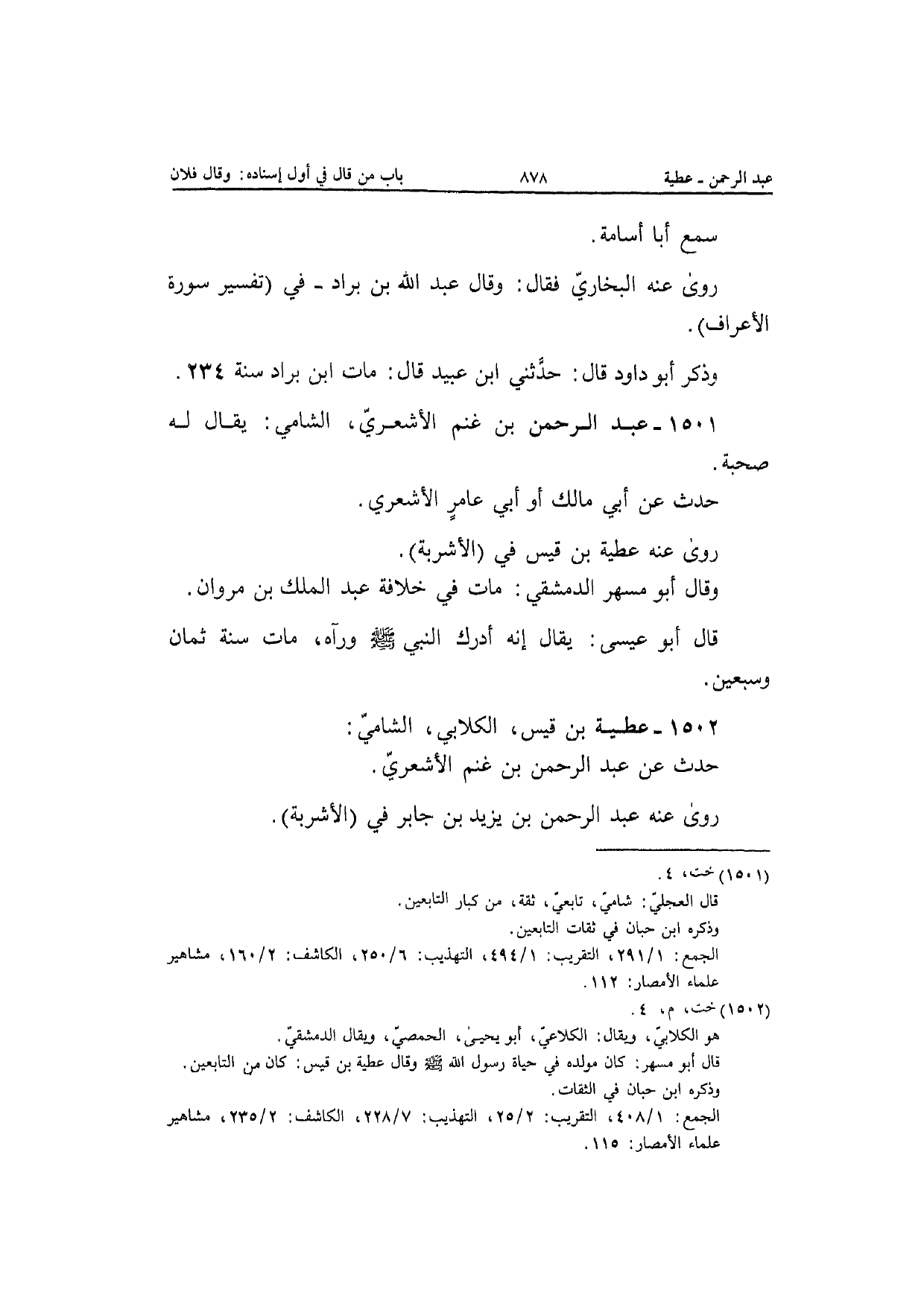 1502 - عَطِيَّة بن قيس الْكلابِي الشَّامي حدث عَن عبد الرَّحْمَن بن غنم الْأَشْعَرِيّ رَوَى عَنهُ عبد الرَّحْمَن بن يزِيد بن جَابر فِي الْأَشْرِبَة