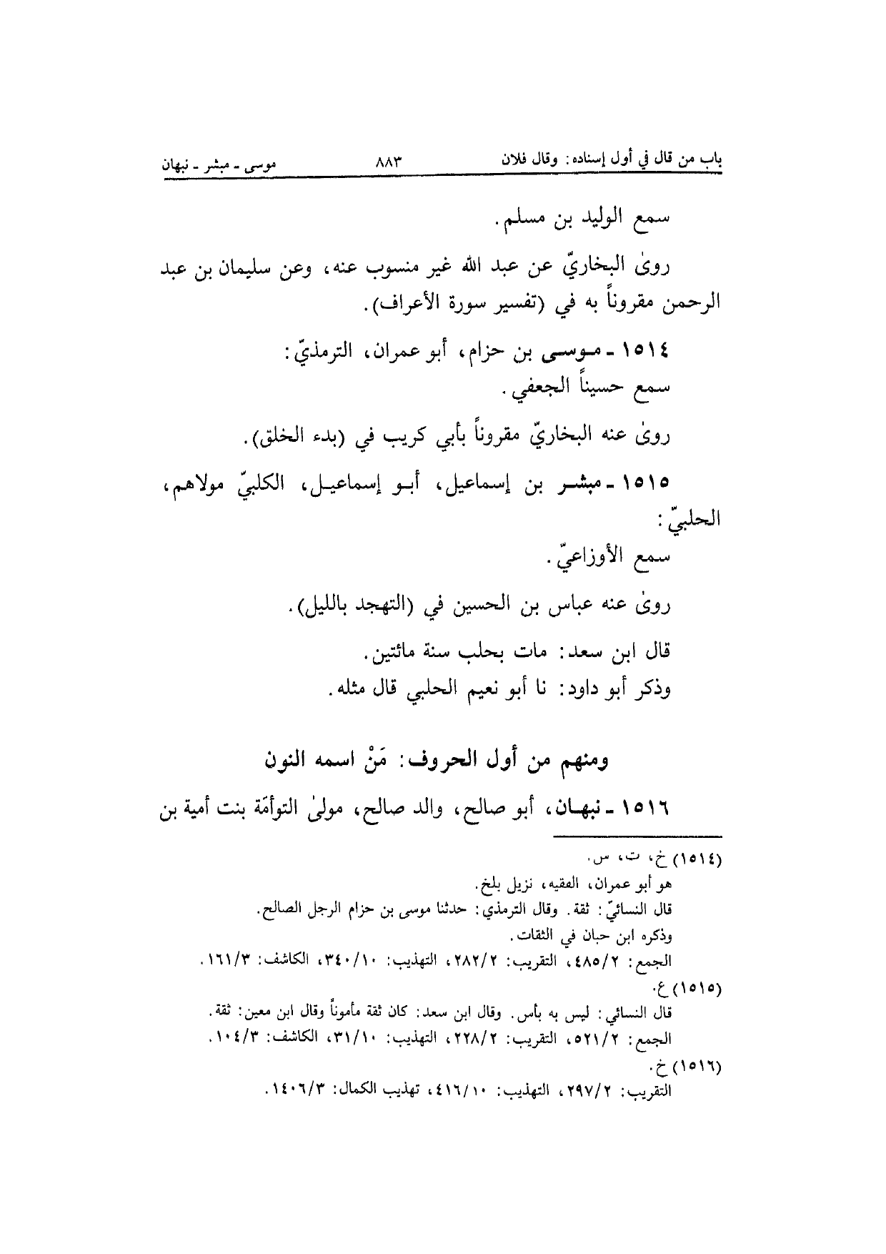 1514 - مُوسَى بن حزَام أَبُو عمرَان التِّرْمِذِيّ سمع حُسَيْنًا الْجعْفِيّ رَوَى عَنهُ البُخَارِيّ مَقْرُونا بِأبي كريب فِي بَدْء الْخلق