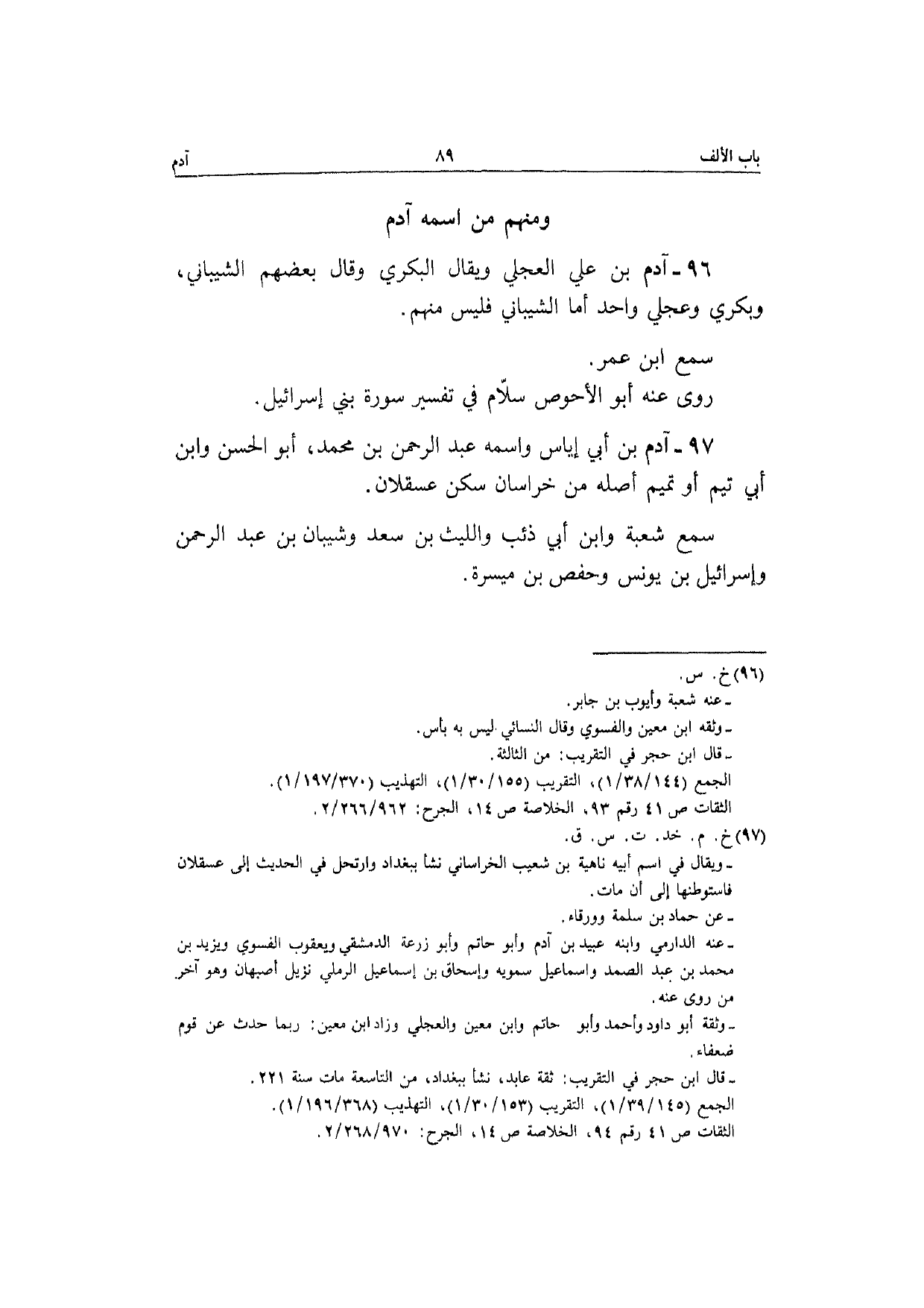 96 - آدم بن عَلّي الْعجلِيّ وَيُقَال الْبكْرِيّ وَقَالَ بَعضهم الشَّيْبَانِيّ وبكري وعجلي وَاحِد أما الشَّيْبَانِيّ فَلَيْسَ مِنْهُم سمع ابْن عمر رَوَى عَنهُ أَبُو الْأَحْوَص سَلام فِي تَفْسِير سُورَة بني إِسْرَائِيل