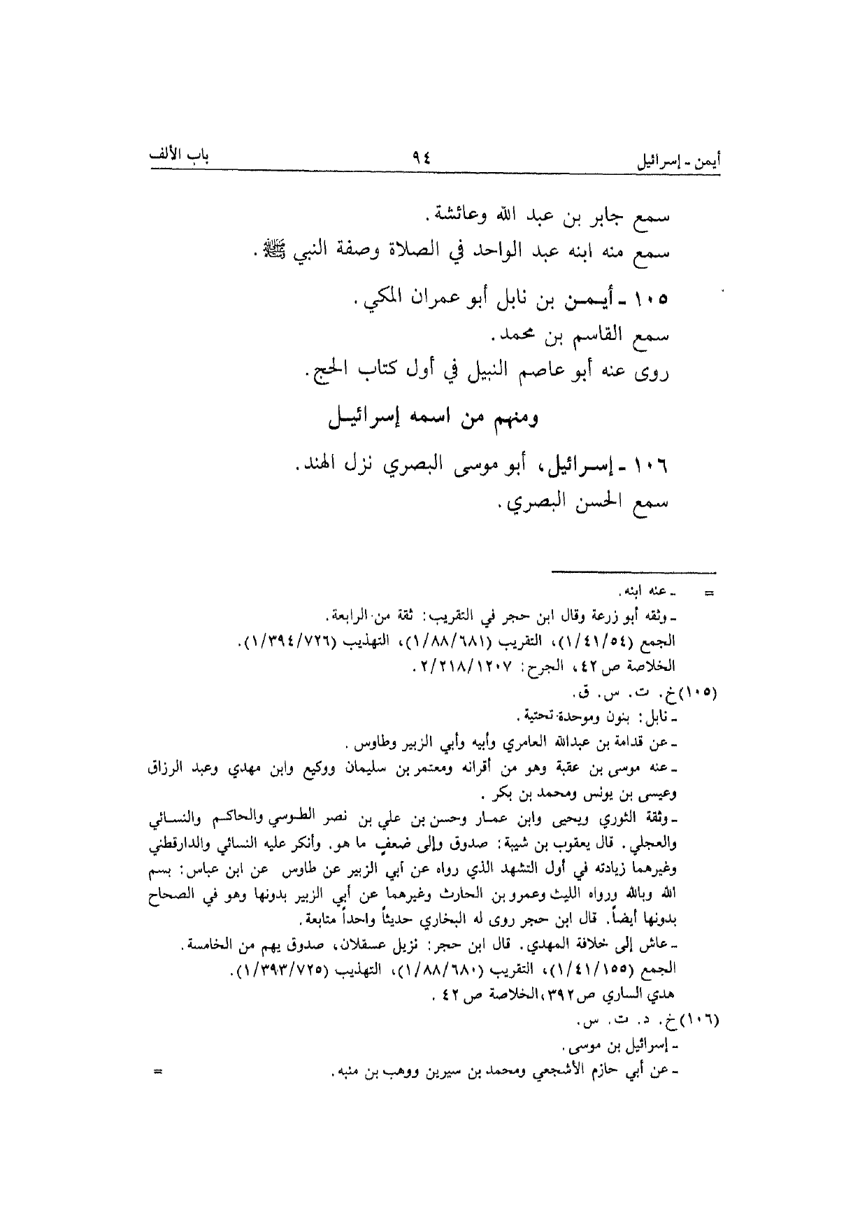 105 - أَيمن بن نابل أَبُو عمرَان الْمَكِّيّ سمع الْقَاسِم بن مُحَمَّد رَوَى عَنهُ أَبُو عَاصِم النَّبِيل فِي أول كتاب الْحَج