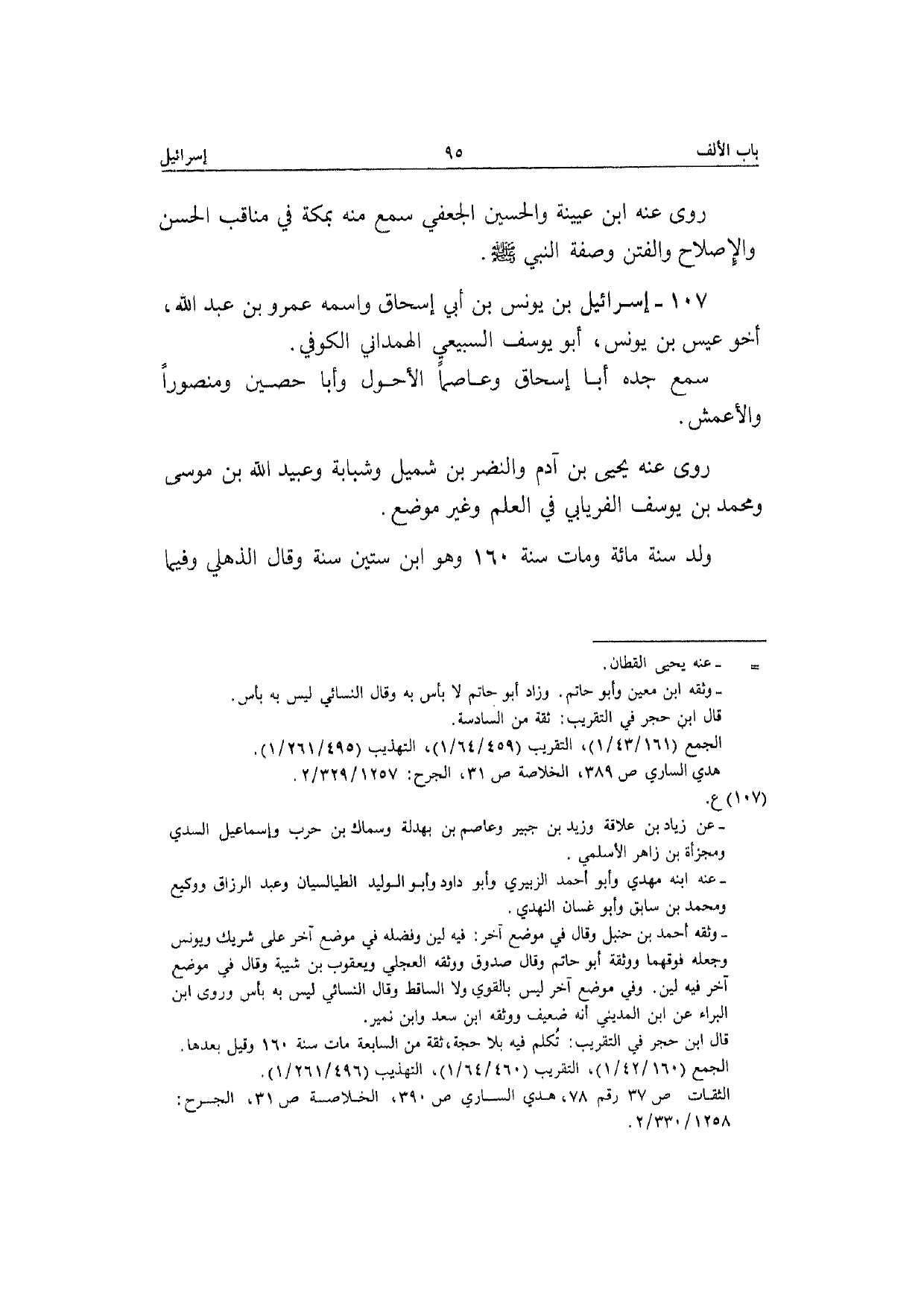 107 - إِسْرَائِيل بن يُونُس بن أبي إِسْحَاق واسْمه عَمْرو بن عبد الله أَخُو عِيسَى بن يُونُس أَبُو يُوسُف السبيعِي الْهَمدَانِي الْكُوفِي سمع جده أَبَا إِسْحَاق وعاصما الْأَحول وَأَبا حُصَيْن ومنصورا وَالْأَعْمَش رَوَى عَنهُ يَحْيَى بن آدم وَالنضْر بن شُمَيْل وشبابة وَعبيد الله بن مُوسَى وَمُحَمّد بن يُوسُف الْفرْيَابِيّ فِي الْعلم وَغير مَوضِع ولد سنة مائَة وَمَات سنة 160 وَهُوَ ابْن سِتِّينَ سنة وَقَالَ الذهلي وَفِيمَا