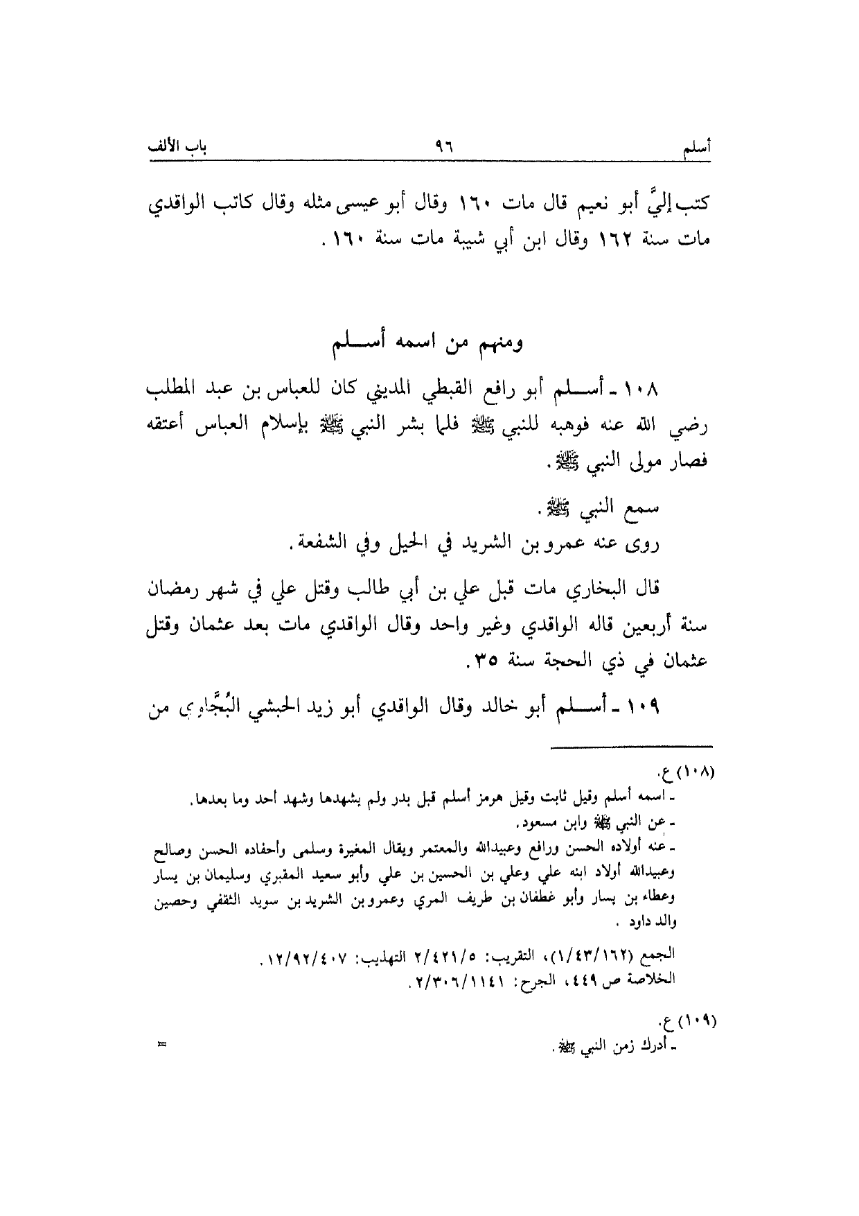 108 - أسلم أَبُو رَافع القبطي الْمَدِينِيّ كَانَ للْعَبَّاس بن عبد الْمطلب رَضِي الله تَعَالَى عَنهُ فوهبه للنَّبِي صَلَّى الله عَلَيْهِ وَسلم فَلَمَّا بشر النَّبِي صَلَّى الله عَلَيْهِ وَسلم بِإِسْلَام الْعَبَّاس أعْتقهُ فَصَارَ مولَى النَّبِي صَلَّى الله عَلَيْهِ وَسلم سمع النَّبِي صَلَّى الله عَلَيْهِ وَسلم رَوَى عَنهُ عَمْرو بن الشريد فِي الْحِيَل وَفِي الشُّفْعَة قَالَ البُخَارِيّ مَاتَ قبل عَلّي بن أبي طَالب وَقتل عَلّي فِي شهر رَمَضَان سنة أَرْبَعِينَ قَالَه الْوَاقِدِيّ وَغير وَاحِد وَقَالَ الْوَاقِدِيّ مَاتَ بعد عُثْمَان وَقتل عُثْمَان فِي ذِي الْحجَّة سنة 35