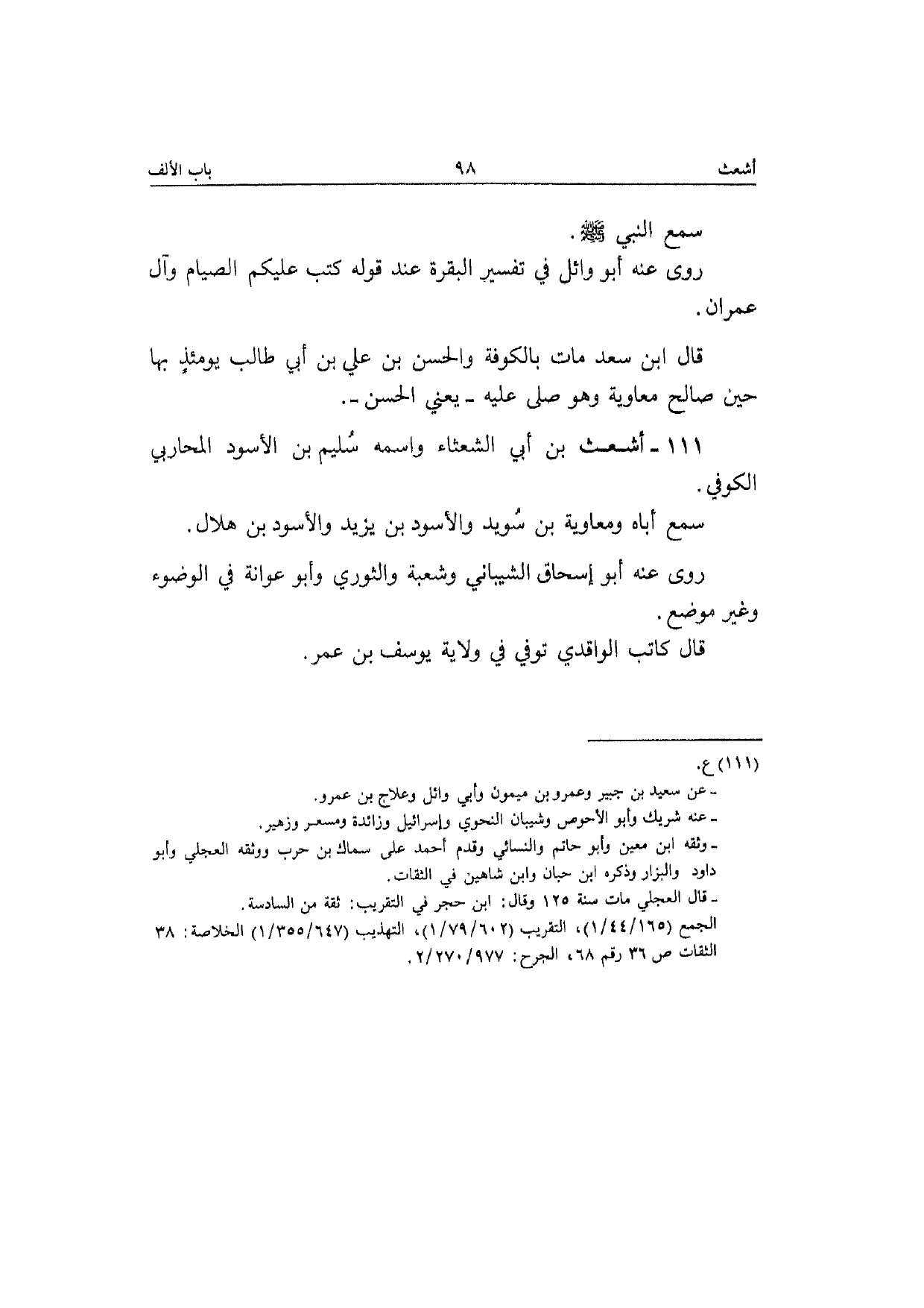 111 - أَشْعَث بن أبي الشعْثَاء واسْمه سليم بن الْأسود الْمحَاربي الْكُوفِي سمع أَبَاهُ وَمُعَاوِيَة بن سُوَيْد وَالْأسود بن هِلَال رَوَى عَنهُ أَبُو إِسْحَاق الشَّيْبَانِيّ وَشعْبَة وَالثَّوْري وَأَبُو عوَانَة فِي الْوضُوء وَغير مَوضِع قَالَ كَاتب الْوَاقِدِيّ توفّي فِي ولَايَة يُوسُف بن عمر
