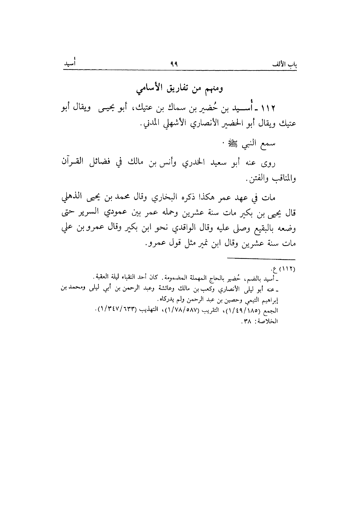 112 - أسيد بن حضير بن سماك بن عتِيك أَبُو يَحْيَى وَيُقَال أَبُو عتِيك وَيُقَال أَبُو الْحضير الْأنْصَارِيّ الأشْهَلِي الْمدنِي سمع النَّبِي صَلَّى الله عَلَيْهِ وَسلم رَوَى عَنهُ أَبُو سعيد الْخُدْرِيّ وانس بن مَالك فِي فَضَائِل الْقُرْآن والمناقب والفتن مَاتَ فِي عهد عمر هَكَذَا ذكره البُخَارِيّ وَقَالَ مُحَمَّد بن يَحْيَى الذهلي قَالَ يَحْيَى بن بكير مَاتَ سنة عشْرين وَحمله عمر بن عمودي السرير حَتَّى وَضعه بِالبَقِيعِ وَصَلى عَلَيْهِ وَقَالَ الْوَاقِدِيّ نَحْو ابْن بكير وَقَالَ عَمْرو بن عَلّي مَاتَ سنة عشْرين وَقَالَ ابْن نمير مثل قَول عَمْرو