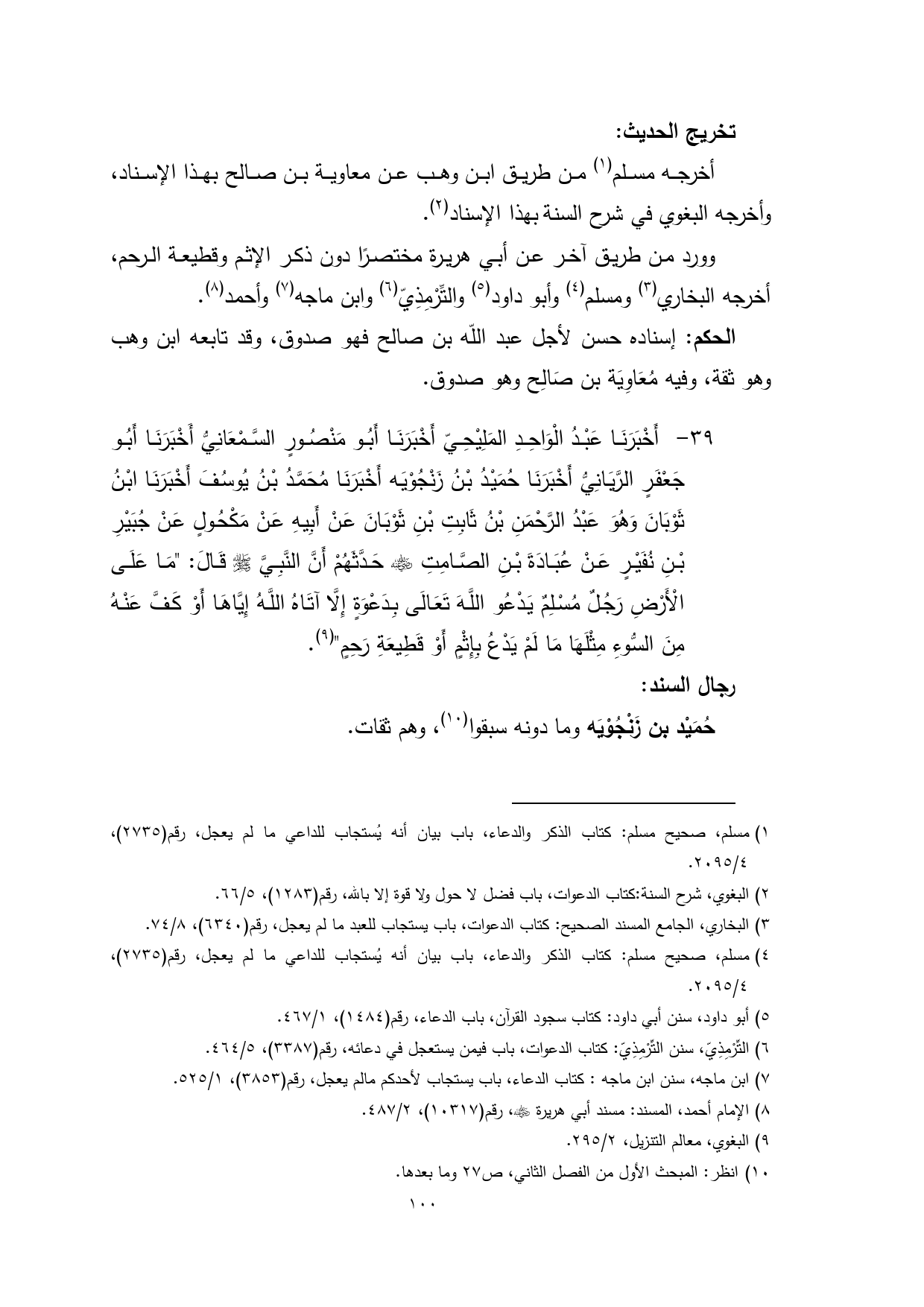 39 - أَخْبَرَنَا عَبْدُ الْوَاحِدِ المَلِيْحِيّ أَخْبَرَنَا أَبُو مَنْصُورٍ السَّمْعَانِيُّ أَخْبَرَنَا أَبُو جَعْفَرٍ الرَّيَانِيُّ أَخْبَرَنَا حُمَيْدُ بْنُ زَنْجُوْيَه أَخْبَرَنَا مُحَمَّدُ بْنُ يُوسُفَ أَخْبَرَنَا ابْنُ ثَوْبَانَ وَهُوَ عَبْدُ الرَّحْمَنِ بْنُ ثَابِتِ بْنِ ثَوْبَانَ عَنْ أَبِيهِ عَنْ مَكْحُولٍ عَنْ جُبَيْرِ بْنِ نُفَيْرٍ عَنْ عُبَادَةَ بْنِ الصَّامِتِ - رضي الله عنه - حَدَّثَهُمْ أَنَّ النَّبِيَّ - صلى الله عليه وسلم - قَالَ: "مَا عَلَى الْأَرْضِ رَجُلٌ مُسْلِمٌ يَدْعُو اللَّهَ تَعَالَى بِدَعْوَةٍ إِلَّا آتَاهُ اللَّهُ إِيَّاهَا أَوْ كَفَّ عَنْهُ مِنَ السُّوءِ مِثْلَهَا مَا لَمْ يَدْعُ بِإِثْمٍ أَوْ قَطِيعَةِ رَحِمٍ" (¬9).