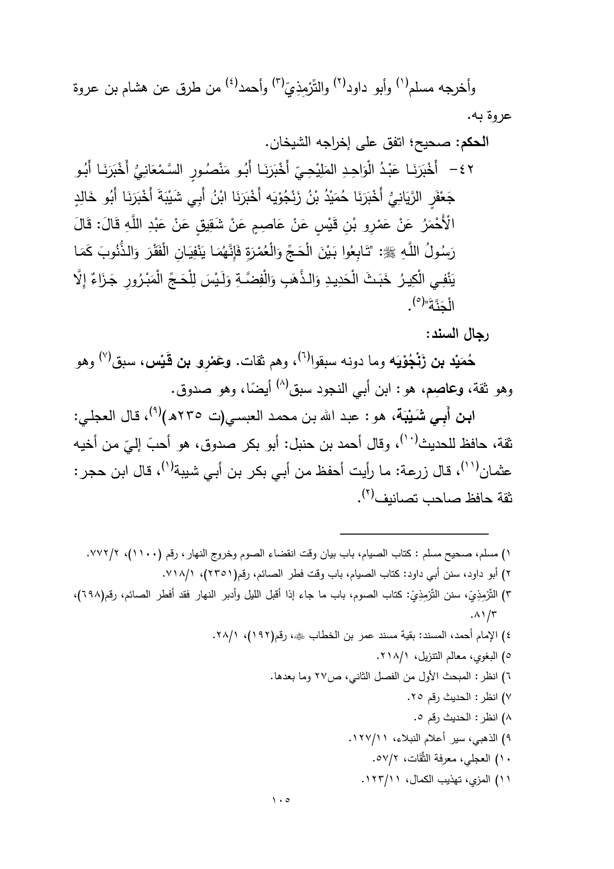 42 - أَخْبَرَنَا عَبْدُ الْوَاحِدِ المَلِيْحِيّ أَخْبَرَنَا أَبُو مَنْصُورٍ السَّمْعَانِيُّ أَخْبَرَنَا أَبُو جَعْفَرٍ الرَّيَانِيُّ أَخْبَرَنَا حُمَيْدُ بْنُ زَنْجُوْيَه أَخْبَرَنَا ابْنُ أَبِي شَيْبَةَ أَخْبَرَنَا أَبُو خَالِدٍ الْأَحْمَرُ عَنْ عَمْرِو بْنِ قَيْسٍ عَنْ عَاصِمٍ عَنْ شَقِيقٍ عَنْ عَبْدِ اللَّهِ قَالَ: قَالَ رَسُولُ اللَّهِ - صلى الله عليه وسلم -: "تَابِعُوا بَيْنَ الْحَجِّ وَالْعُمْرَةِ فَإِنَّهُمَا يَنْفِيَانِ الْفَقْرَ وَالذُّنُوبَ كَمَا يَنْفِي الْكِيرُ خَبَثَ الْحَدِيدِ وَالذَّهَبِ وَالْفِضَّةِ وَلَيْسَ لِلْحَجِّ الْمَبْرُورِ جَزَاءٌ إِلَّا الْجَنَّةَ" (¬5).