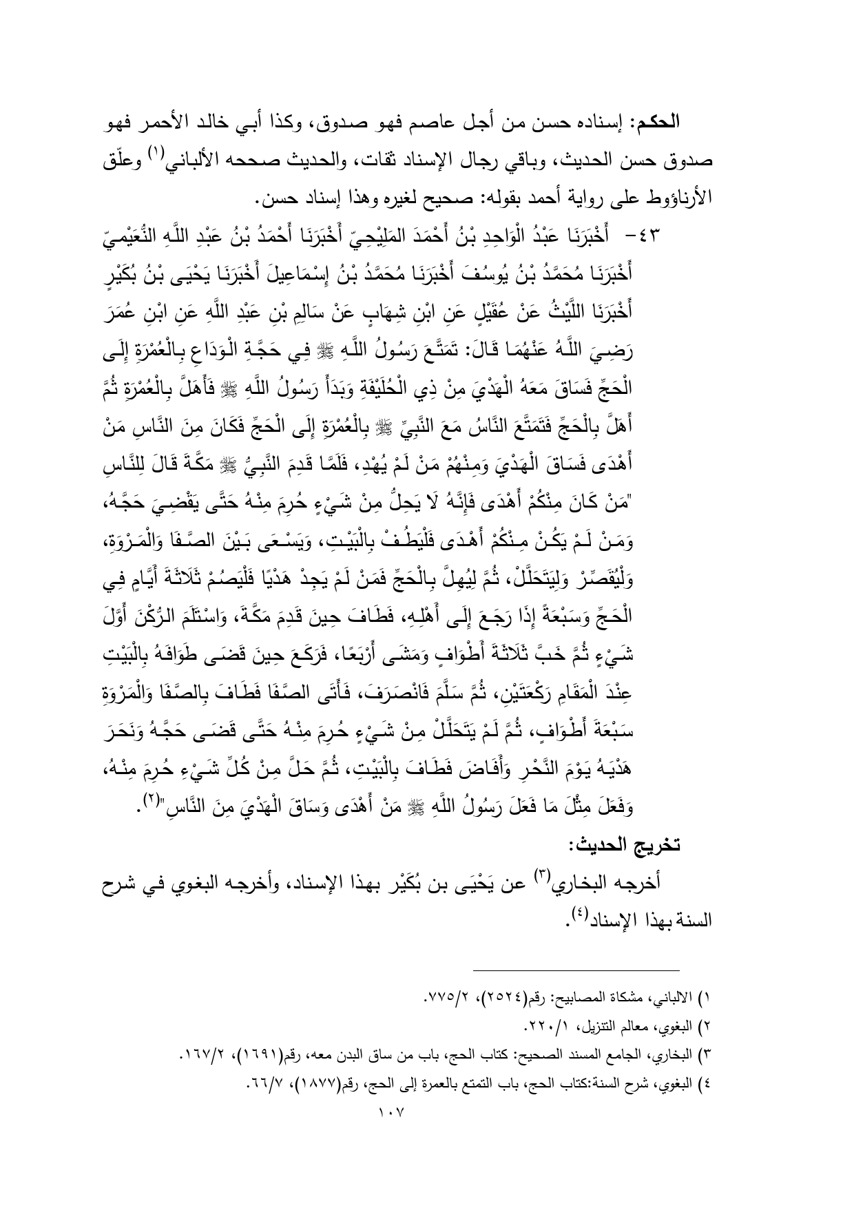 43 - أَخْبَرَنَا عَبْدُ الْوَاحِدِ بْنُ أَحْمَدَ المَلِيْحِيّ أَخْبَرَنَا أَحْمَدُ بْنُ عَبْدِ اللَّهِ النُّعَيْميّ أَخْبَرَنَا مُحَمَّدُ بْنُ يُوسُفَ أَخْبَرَنَا مُحَمَّدُ بْنُ إِسْمَاعِيلَ أَخْبَرَنَا يَحْيَى بْنُ بُكَيْرٍ أَخْبَرَنَا اللَّيْثُ عَنْ عُقَيْلٍ عَنِ ابْنِ شِهَابٍ عَنْ سَالِمِ بْنِ عَبْدِ اللَّهِ عَنِ ابْنِ عُمَرَ رَضِيَ اللَّهُ عَنْهُمَا قَالَ: تَمَتَّعَ رَسُولُ اللَّهِ - صلى الله عليه وسلم - فِي حَجَّةِ الْوَدَاعِ بِالْعُمْرَةِ إِلَى الْحَجِّ فَسَاقَ مَعَهُ الْهَدْيَ مِنْ ذِي الْحُلَيْفَةِ وَبَدَأَ رَسُولُ اللَّهِ - صلى الله عليه وسلم - فَأَهَلَّ بِالْعُمْرَةِ ثُمَّ أَهَلَّ بِالْحَجِّ فَتَمَتَّعَ النَّاسُ مَعَ النَّبِيِّ - صلى الله عليه وسلم - بِالْعُمْرَةِ إِلَى الْحَجِّ فَكَانَ مِنَ النَّاسِ مَنْ أَهْدَى فَسَاقَ الْهَدْيَ وَمِنْهُمْ مَنْ لَمْ يُهْدِ، فَلَمَّا قَدِمَ النَّبِيُّ - صلى الله عليه وسلم - مَكَّةَ قَالَ لِلنَّاسِ "مَنْ كَانَ مِنْكُمْ أَهْدَى فَإِنَّهُ لَا يَحِلُّ مِنْ شَيْءٍ حُرِمَ مِنْهُ حَتَّى يَقْضِيَ حَجَّهُ، وَمَنْ لَمْ يَكُنْ مِنْكُمْ أَهْدَى فَلْيَطُفْ بِالْبَيْتِ، وَيَسْعَى بَيْنَ الصَّفَا وَالْمَرْوَةِ، وَلْيُقَصِّرْ وَلِيَتَحَلَّلْ، ثُمَّ لِيُهِلَّ بِالْحَجِّ فَمَنْ لَمْ يَجِدْ هَدْيًا فَلْيَصُمْ ثَلَاثَةَ أَيَّامٍ فِي الْحَجِّ وَسَبْعَةً إِذَا رَجَعَ إِلَى أَهْلِهِ، فَطَافَ حِينَ قَدِمَ مَكَّةَ، وَاسْتَلَمَ الرُّكْنَ أَوَّلَ شَيْءٍ ثُمَّ خَبَّ ثَلَاثَةَ أَطْوَافٍ وَمَشَى أَرْبَعًا، فَرَكَعَ حِينَ قَضَى طَوَافَهُ بِالْبَيْتِ عِنْدَ الْمَقَامِ رَكْعَتَيْنِ، ثُمَّ سَلَّمَ فَانْصَرَفَ، فَأَتَى الصَّفَا فَطَافَ بِالصَّفَا وَالْمَرْوَةِ سَبْعَةَ أَطْوَافٍ، ثُمَّ لَمْ يَتَحَلَّلْ مِنْ شَيْءٍ حُرِمَ مِنْهُ حَتَّى قَضَى حَجَّهُ وَنَحَرَ هَدْيَهُ يَوْمَ النَّحْرِ وَأَفَاضَ فَطَافَ بِالْبَيْتِ، ثُمَّ حَلَّ مِنْ كُلِّ شَيْءِ حُرِمَ مِنْهُ، وَفَعَلَ مِثْلَ مَا فَعَلَ رَسُولُ اللَّهِ - صلى الله عليه وسلم - مَنْ أَهْدَى وَسَاقَ الْهَدْيَ مِنَ النَّاسِ" (¬2).